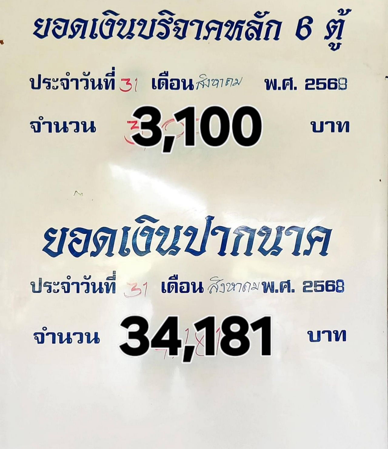 โดยยอดเงินที่กรรมการนับได้จากตู้บริจาคทั้ง 6 ตู้ เมื่อวันที่ 31 สิงหาคม 68 ยอดรวม 3,100 บาท ส่วนยอดรวมเงินปากนาค 34,181 บาท ขณะที่เลขในขันน้ำมนต์ของพ่อจ้ำนั้น หลายคนเห็นเป็นเลข 1, 4 และ 6 ซึ่งก็แล้วแต่คนจะจับเลขไปเสี่ยงโชค