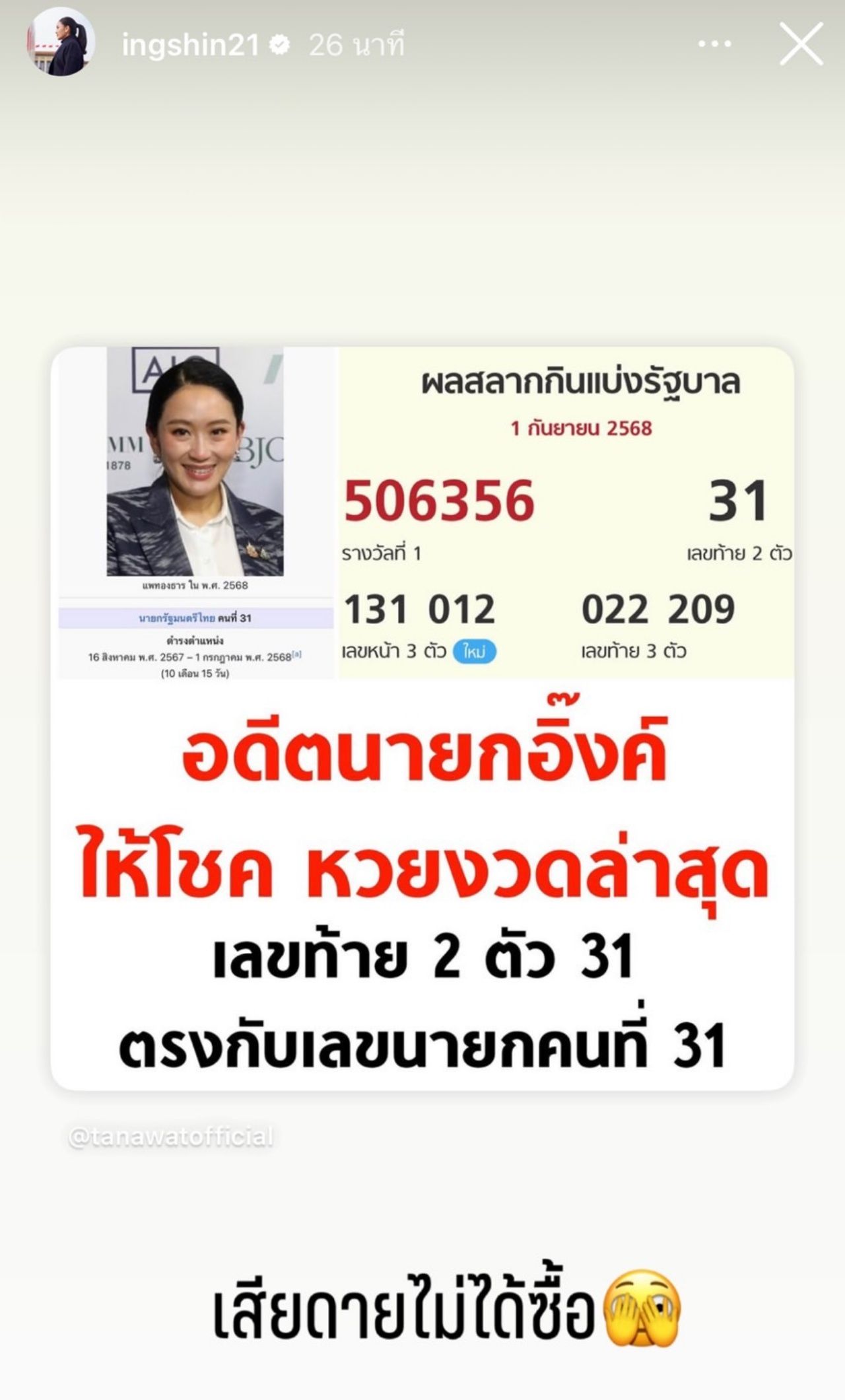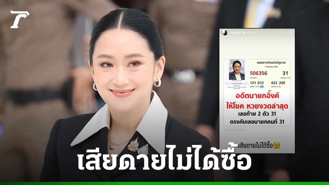 "อดีตนายกฯ อิ๊งค์" โพสต์สตอรี่ไอจีบอก "เสียดายไม่ได้ซื้อ" หลังหวยออกเลขท้าย 2 ตัว 31 ตรงกับเลขนายกรัฐมนตรีคนที่ 31