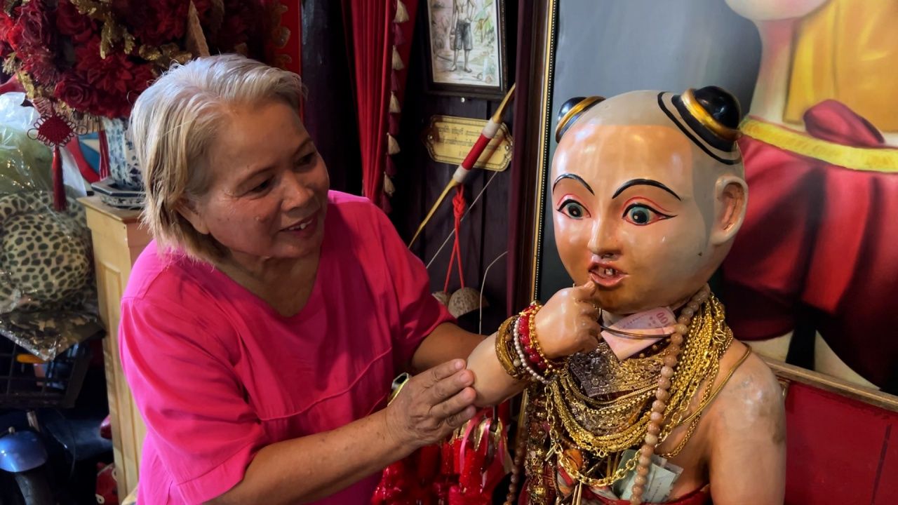 เย็นวันที่ 30 ก.ย. 2568 ผู้สื่อข่าวรายงานว่า ที่วัดทรงเสวย อ.วัดสิงห์ จ.ชัยนาท นางมะไฟ มาคุ้ม อายุ 67 ปี ชาวชัยนาท เดินทางมายังที่ศาลาไอ้ส้มฉุน โดยนำของโปรดของไอ้ส้มฉุน อย่างน้ำแดง ขนมขบเคี้ยว ของเล่น เสื้อผ้าสีแดง และรองเท้าแตะอีกจำนวน 58 คู่ เพื่อมาแก้บน หลังถูกรางวัลเลขท้าย 2 ตัว สลากกินแบ่งรัฐบาลจำนวน 20 ใบ รับทรัพย์ 40,000 บาท ในงวดที่ผ่านมา ซึ่งเลขเด็ดนั้นมาจากการล้วงไหพารวยไอ้ส้มฉุน จากนั้นก็ไม่พลาดที่จะล้วงไหพารวยอีกรอบ โดยได้เลข 328 ทำเอาคอหวยต่างรีบจดหวังเฮงตามรอยคนดวงเฮงคนนี้กันเป็นแถว