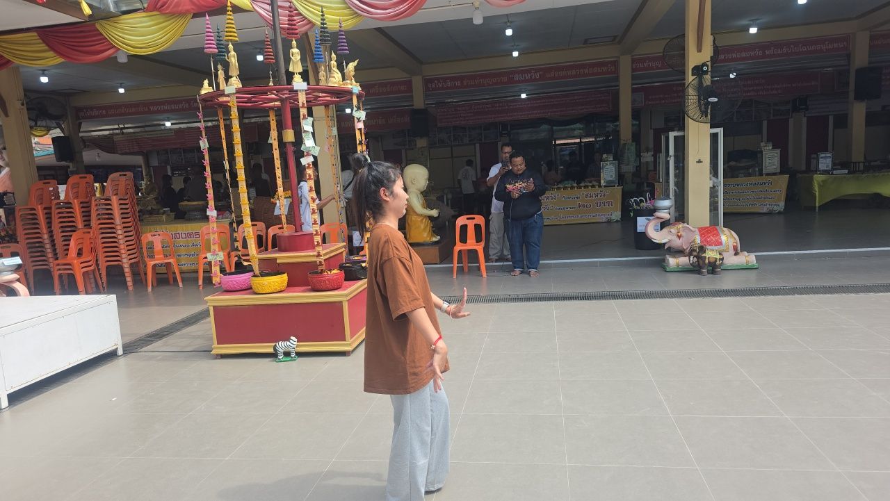 โดยที่ลานด้านล่างองค์หลวงพ่อสมหวัง ซึ่งเป็นที่ขอพร มีเสียงประทัดจุดดัง ชาวบ้านกำลังมุงดูหญิงสาววัยรุ่นฟ้อนรำ ไม่ได้แต่งชุดนางรำแต่อย่างใด ใส่กางเกงยีนส์สวมเสื้อยืดสีน้ำตาล ร่ายรำอย่างชดช้อยสวยงาม โดยมีเสียงเพลงประกอบ ใช้เวลารำประมาณ 20 นาที หลังจบเพลงแล้วสาธุชนที่มามุงดูต่างปรบมือให้ เมื่อเสร็จสิ้นได้นำดอกไม้ธูปเทียน ถวายบอกกล่าวพร้อมกับยกมือพนมกราบไหว้ ถวายสมหวัง 1 ถุงใหญ่