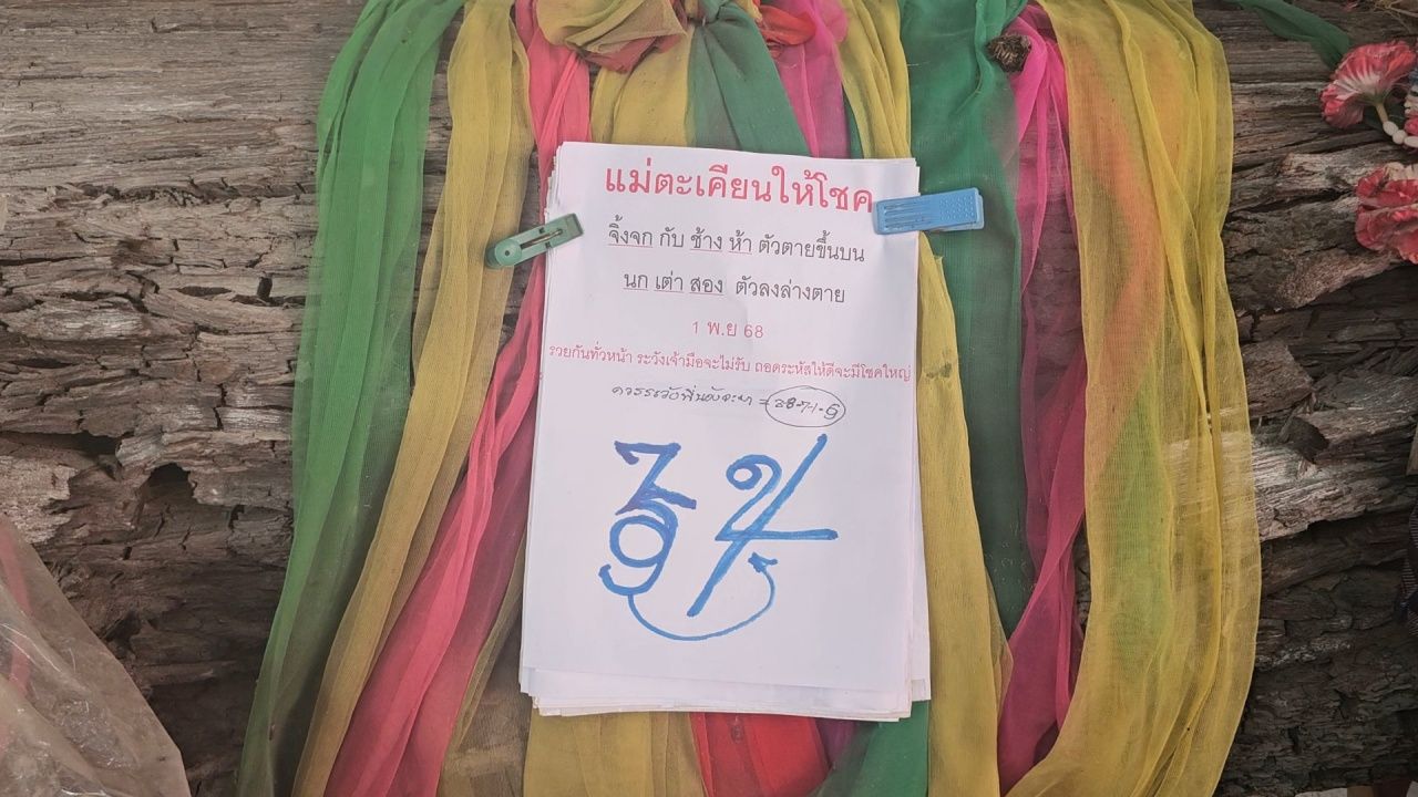 สำหรับที่ลำต้นตะเคียนมีกระดาษติดอยู่ โดยระบุข้อความพร้อมตัวเลขว่า "จิ้งจกกับช้างห้าตัวตายขึ้นบน นกเต่าสองตัวลงล่างตาย" พร้อมด้วยเลข 759, 24 ทำให้บรรดาคอหวยไม่พลาดไปซื้อลอตเตอรี่เลขดังกล่าวไว้เสี่ยงโชคงวดนี้ 1/11/68.