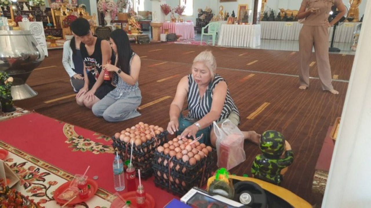 ส่วนด้านนางสาวอรัญญา ทองแสง นำไข่ไก่ 300 ฟอง พร้อมด้วยประทัด 1,000 นัด และเครื่องเซ่นไหว้มาแก้บนไอ้ไข่วัดบึงบา หลังได้ค่าชดเชยสินไหมของลูกชายจากคู่กรณี
