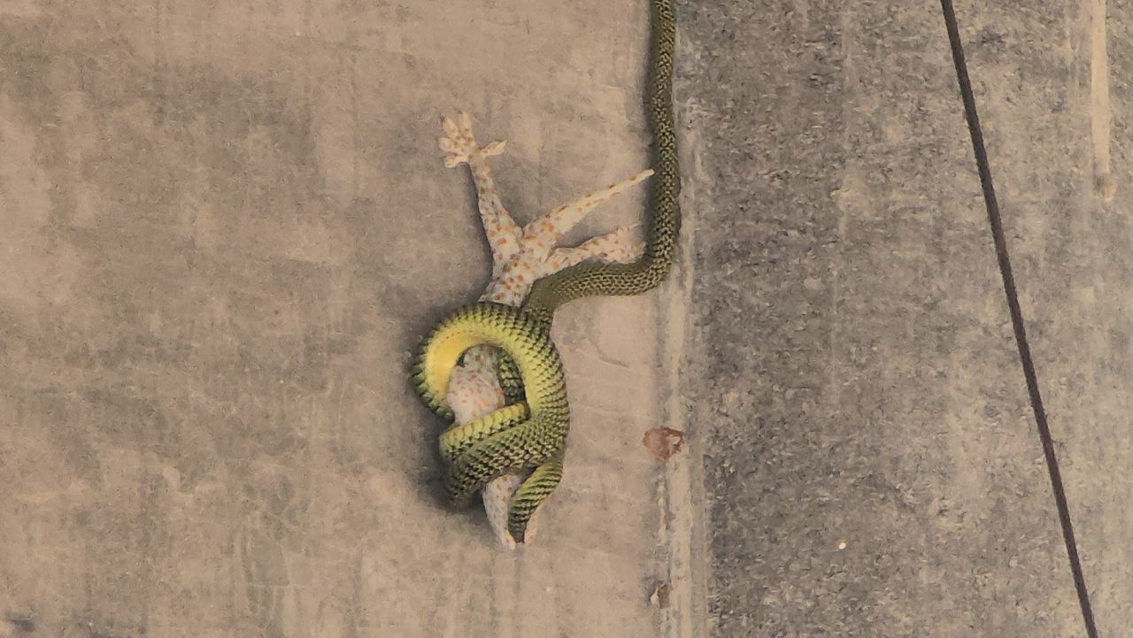 จากการสอบถาม น.ส.เบญญาพร ผู้เห็นเหตุการณ์ เปิดเผยว่า เวลาประมาณบ่ายโมง ตนเองได้ยินเสียงตุ๊กแกร้องเหมือนถูกทุบ คล้ายถูกจับรัด บนผนังสูงของโรงงาน ตนหันไปมองเห็นงูเขียวตัวโตยาวประมาณ 2 เมตรกำลังใช้ร่างรัดตุ๊กแกอยู่ ขณะที่ฝ่ายตุ๊กแกก็ได้งับงูเขียวเอาไว้