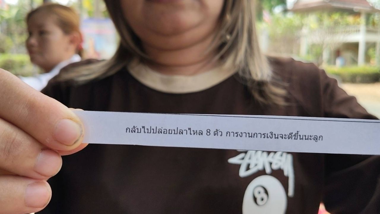 และก่อนกลับได้ตักไข่ได้คำทำนายว่า “กลับไปปล่อยปลาไหล 8 ตัว การงานการเงินจะดีขึ้นนะลูก” และได้ธูปมงคล 1 ดอกนำไปจุดได้เลข 707 ส่วนของแฟนได้ 257 นำกลับไปลุ้นโชคในงวดต่อไป