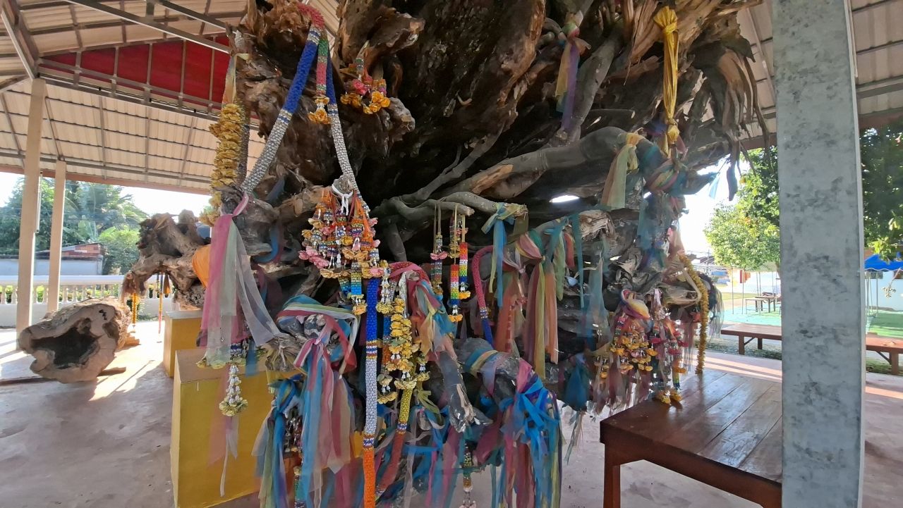 ชาวบ้านสายมูก็ได้มาขอโชคขอลาภ หากใครประสบผลสำเร็จ ก็จะนำพวงมาลัยดอกไม้ธูปเทียน พร้อมกับเครื่องบวงสรวงตามแต่ใครจะอธิษฐานอะไรไว้ ก็จะนำสิ่งนั้นมาถวายแก้บน สังเกตได้ว่า ภายในต้นมะขามยักษ์ที่มีความเก่าแก่ จะมีพวงดอกไม้มากมาย ซึ่งในช่วงกลางเดือนเมษายน ชาวบ้านจะทำบุญเปลี่ยนผ้าคลุม ให้กับต้นมะขามยักษ์นี้เป็นประจำทุกปี.
