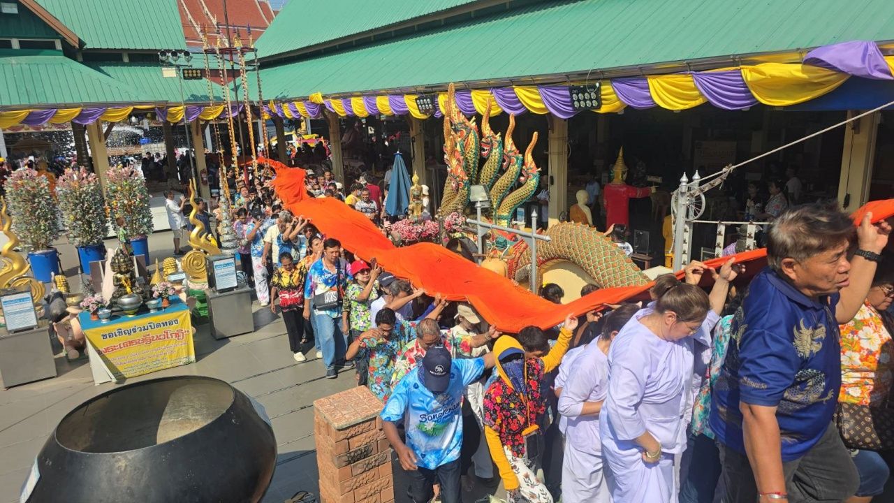 วันที่ 15 เม.ย. 69 ผู้สื่อข่าวรายงานว่า เมื่อช่วงบ่ายวันนี้ ที่วัดกลางบางพระ (หลวงพ่อสมหวัง) ต.บางพระ อ.นครชัยศรี จ.นครปฐม พระครูศรีสุตากร เจ้าอาวาสวัดกลางบางพระ ได้ประกอบพิธีแห่ผ้าห่มองค์หลวงพ่อสมหวัง พระพุทธรูปสูง 30 เมตร ซึ่งจัดในช่วงเทศกาลสงกรานต์ของทุกๆ ปี เป็นพิธีที่มีมาอย่างยาวนานกว่า 40 ปี โดยชาวบ้านจะแห่ผ้าห่มที่มีความยาวกว่า 30 เมตร จากหน้าวัดเคลื่อนขบวนเข้าสู่ด้านหน้าองค์หลวงพ่อสมหวัง เดินระยะทางกว่า 2 กม. เพื่อให้เจ้าหน้าที่วัดนำขึ้นไปห่มองค์หลวงพ่อสมหวัง