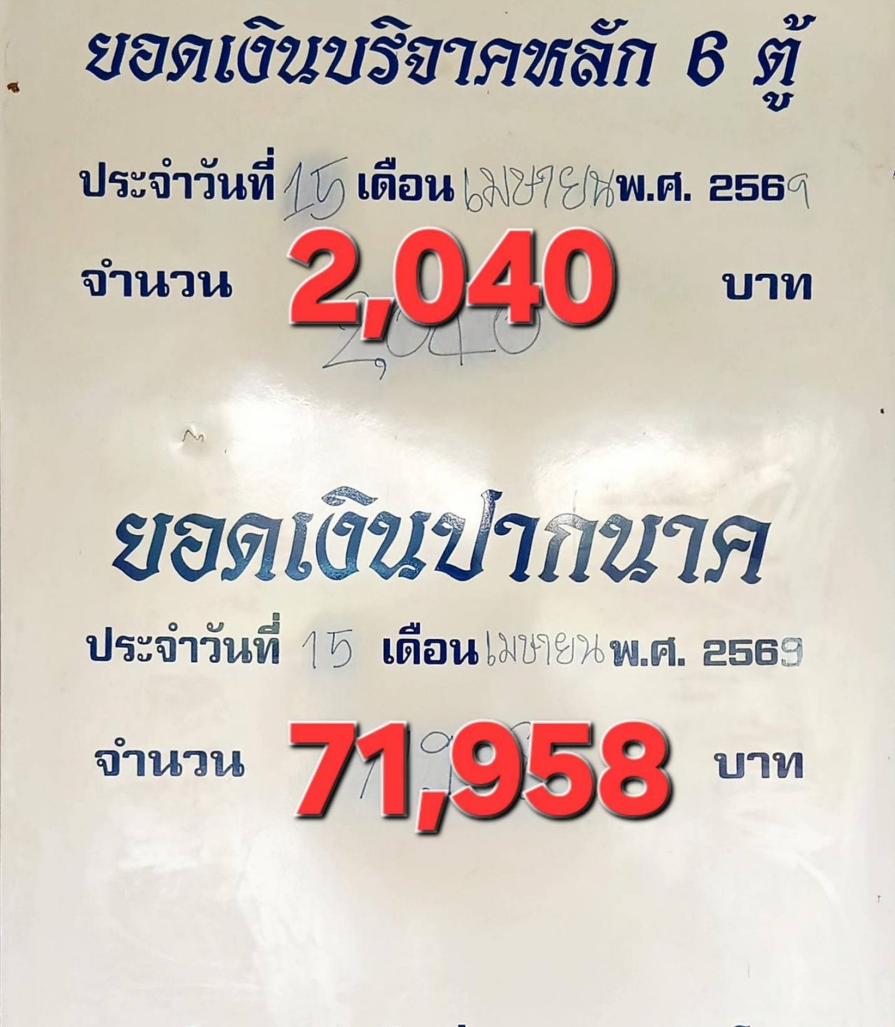 ขณะที่คอหวยบางส่วน ได้ส่องยอดตัวเลขจากเงินปากนาค พร้อมเผื่อว่าพ่อปู่แม่ย่าให้โชครับปีใหม่ไทย โดยยอดเงินบริจาครวม 6 ตู้ 2,040 บาท ส่วนยอดเงินปากนาคยอดรวม 71,958 บาท