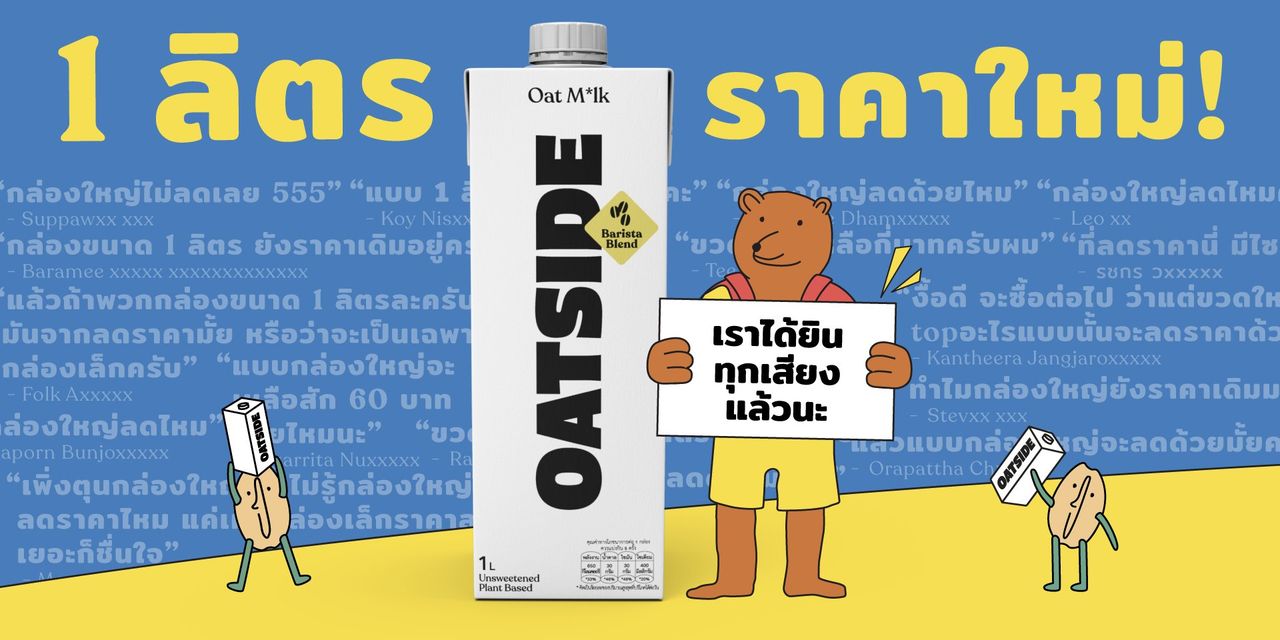กลายเป็นไวรัลบนโซเชียลอีกครั้ง เมื่อ OATSIDE แบรนด์นมโอ๊ตจากสิงคโปร์ ประกาศลดราคา นมโอ๊ตไซด์ขนาด 1 ลิตร จาก 112 บาท เหลือเพียง 59 บาท จุดกระแสให้คอกาแฟและเจ้าของคาเฟ่แห่กันไปซื้อเกลี้ยงห้างในเวลาอันรวดเร็ว เรียกได้ว่า ครองใจผู้บริโภคไทยได้อีกครั้งอย่างสวยงาม