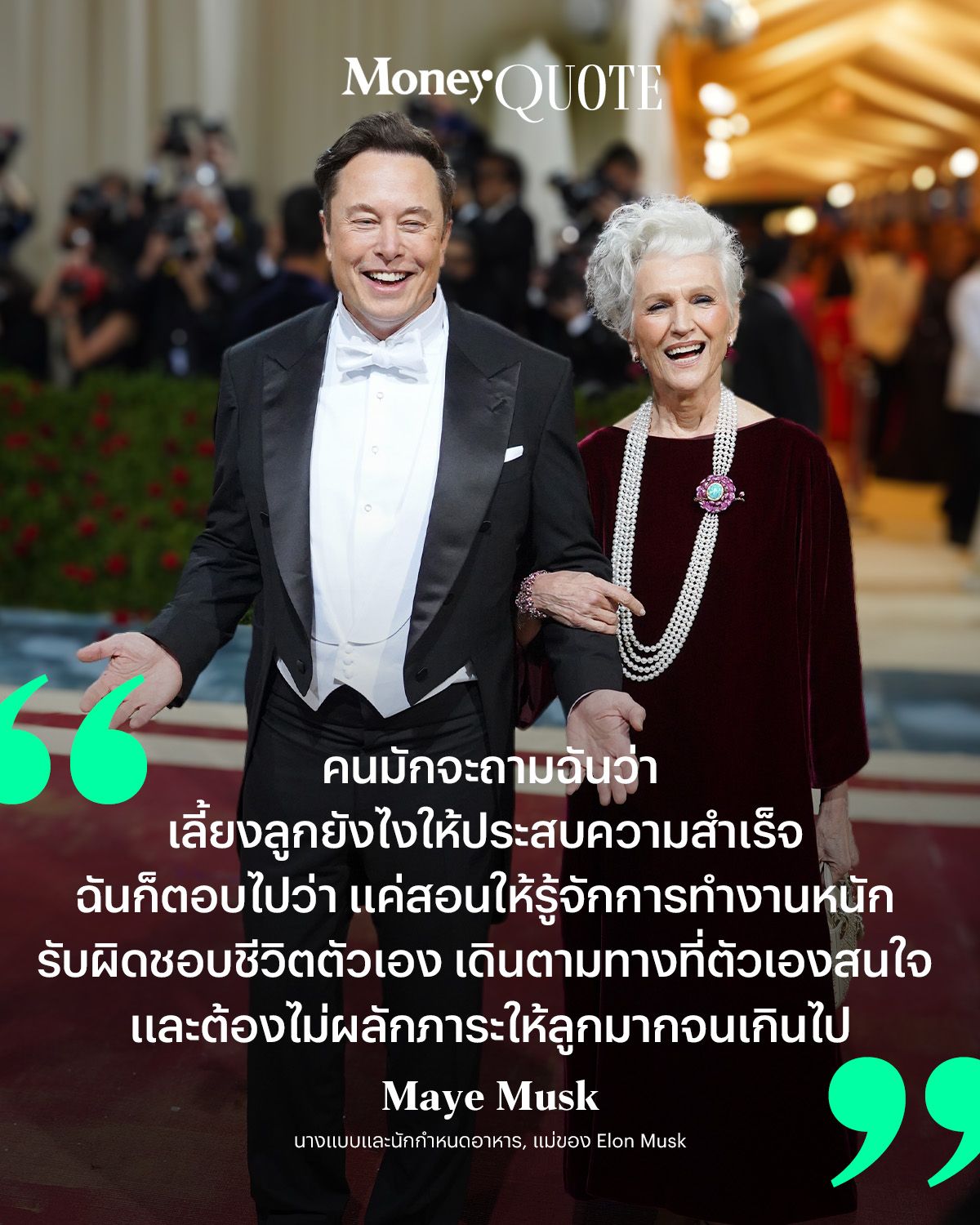 “หลายคนมักถามว่าฉันเลี้ยงลูกให้ประสบความสำเร็จได้ยังไง ฉันก็ตอบไปว่า แค่สอนให้พวกเขารู้จักการทำงานหนัก และปล่อยให้พวกเขาเดินตามความสนใจของตัวเอง” Maye Musk กล่าวในบทความ