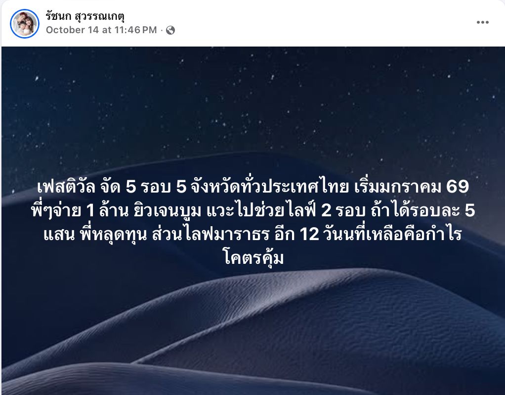 สุดท้าย เจนนี่ ได้เล่าถึง งานมหกรรมเฟสติวัล Live Market ที่ต่อยอดจากการไลฟ์สดในโลกออนไลน์สู่ออฟไลน์อีเวนท์ที่จะจัดขึ้นทั่วประเทศ โดยเริ่มต้นที่ภาคกลางในเดือนมกราคมปี 2569 เป็นต้นไป งานนี้เปิดรับทั้ง บูธแบรนด์ดัง แบรนด์ไทย บูธศิลปินดารา ร้านค้ารายย่อยที่ต้องการพื้นที่ขายสินค้า ซึ่งเธอย้ำว่า งานนี้มีเป้าหมายในการกระจายรายได้สู่แบรนด์ไทยและร้านค้าทั่วประเทศ พร้อมทั้งแนะนำให้คนที่ตกงานหรือไม่มีอาชีพมาร่วม โดยขอแค่มีเพียงโทรศัพท์หนึ่งเครื่องมาเรียนรู้และทดลองไปด้วยกัน
