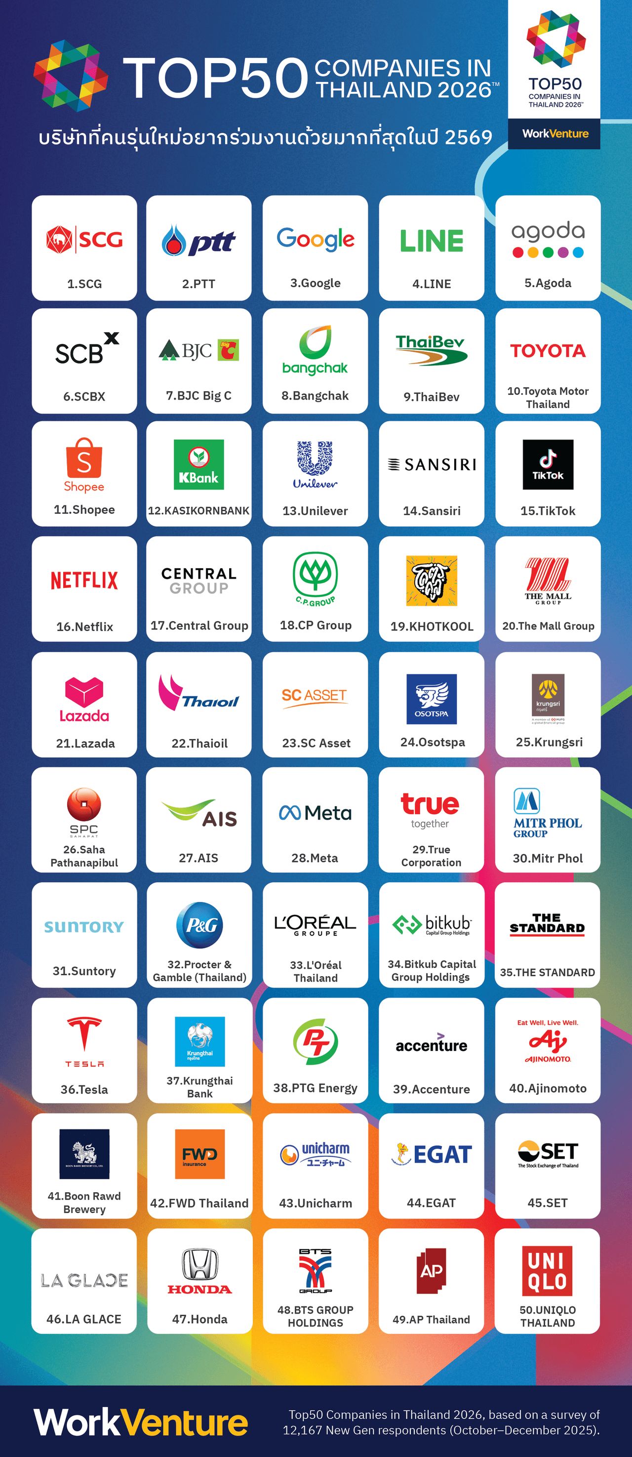 เผยผลสำรวจ “50 องค์กรที่คนรุ่นใหม่อยากร่วมงานมากที่สุด” ผ่านการสำรวจความคิดเห็นจากคนทำงานจำนวน 12,167 คน อายุระหว่าง 22-35 ปี การศึกษาระดับปริญญาตรีขึ้นไป ซึ่งอาศัยอยู่ในกรุงเทพฯ และปริมณฑล ทำการสำรวจระหว่างเดือน ตุลาคม - ธันวาคม ปี 2568