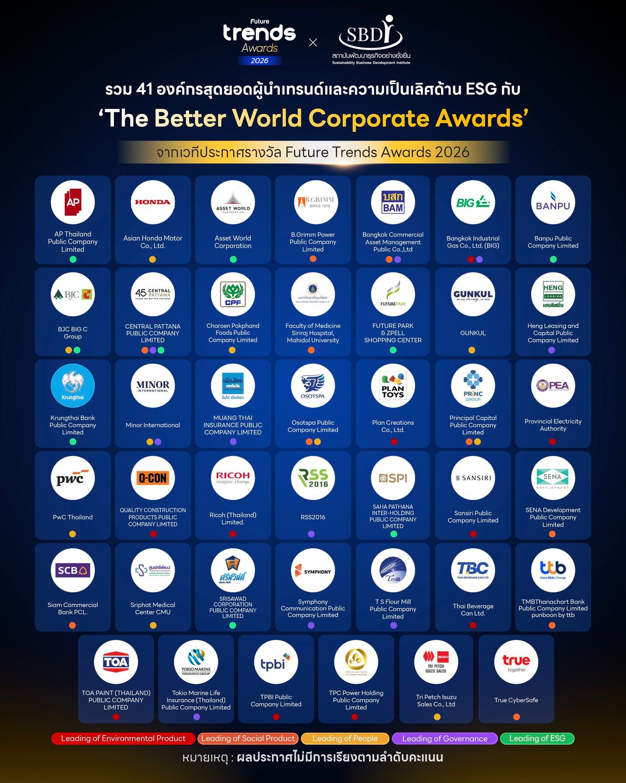 ทั้งนี้กลุ่มรางวัลที่สอง The Better World Corporate Awards จัดขึ้นโดย Future Trends ร่วมกับสถาบันพัฒนาธุรกิจอย่างยั่งยืน (SBDi) เพื่อมอบให้กับองค์กรที่มีผลงานโดดเด่นในด้านการกำกับดูแลองค์กรตามหลักการ ESG แบ่งออกเป็น 5 ประเภทย่อย ได้แก่ Leading of Environmental Product, Leading of Social Product, Leading of People, Leading of Governance และ Leading of ESG
