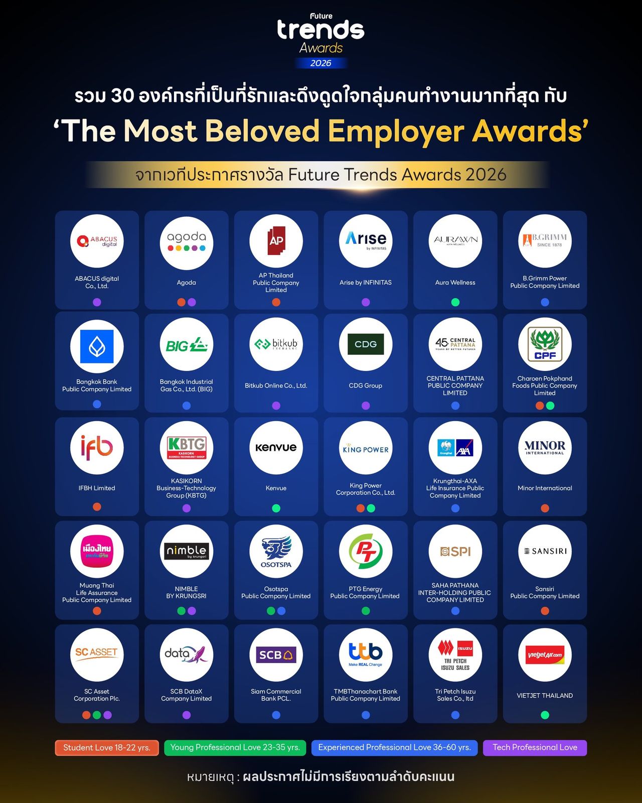 ขณะที่กลุ่มรางวัลที่สาม The Most Beloved Employer Awards จัดขึ้นโดย Future Trends ร่วมกับ JobsDB by SEEK มอบรางวัลให้กับองค์กรที่มีชื่อเสียงและผลงานเป็นที่ยอมรับจนเป็นองค์กรที่พนักงานและคนทำงานอยากร่วมงานด้วยมากที่สุด