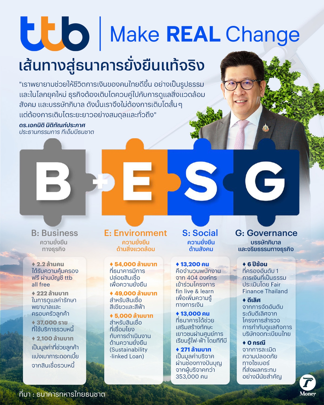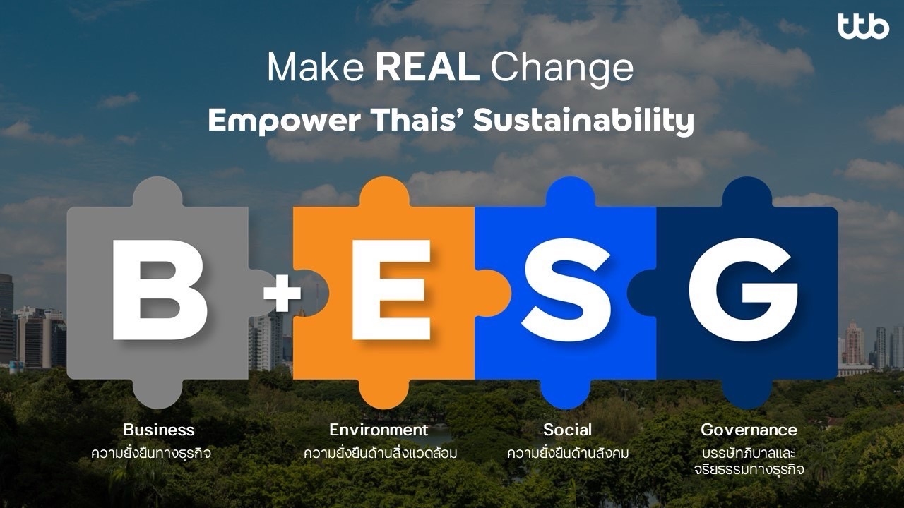 ท่ามกลางความท้าทายของภาคการเงินการธนาคารในปัจจุบัน ทีเอ็มบีธนชาต หรือ ทีทีบี ยังคงมุ่งมั่นในพันธกิจ Make REAL Change “เปลี่ยน… เพื่อให้ชีวิตคุณดีขึ้น” เพื่อยกระดับชีวิตทางการเงินของคนไทยให้ดีขึ้น ผ่านกลยุทธ์ B+ESG ที่ผสานการเติบโตทางธุรกิจควบคู่ไปกับการดูแลด้านสิ่งแวดล้อม สังคม และบรรษัทภิบาล