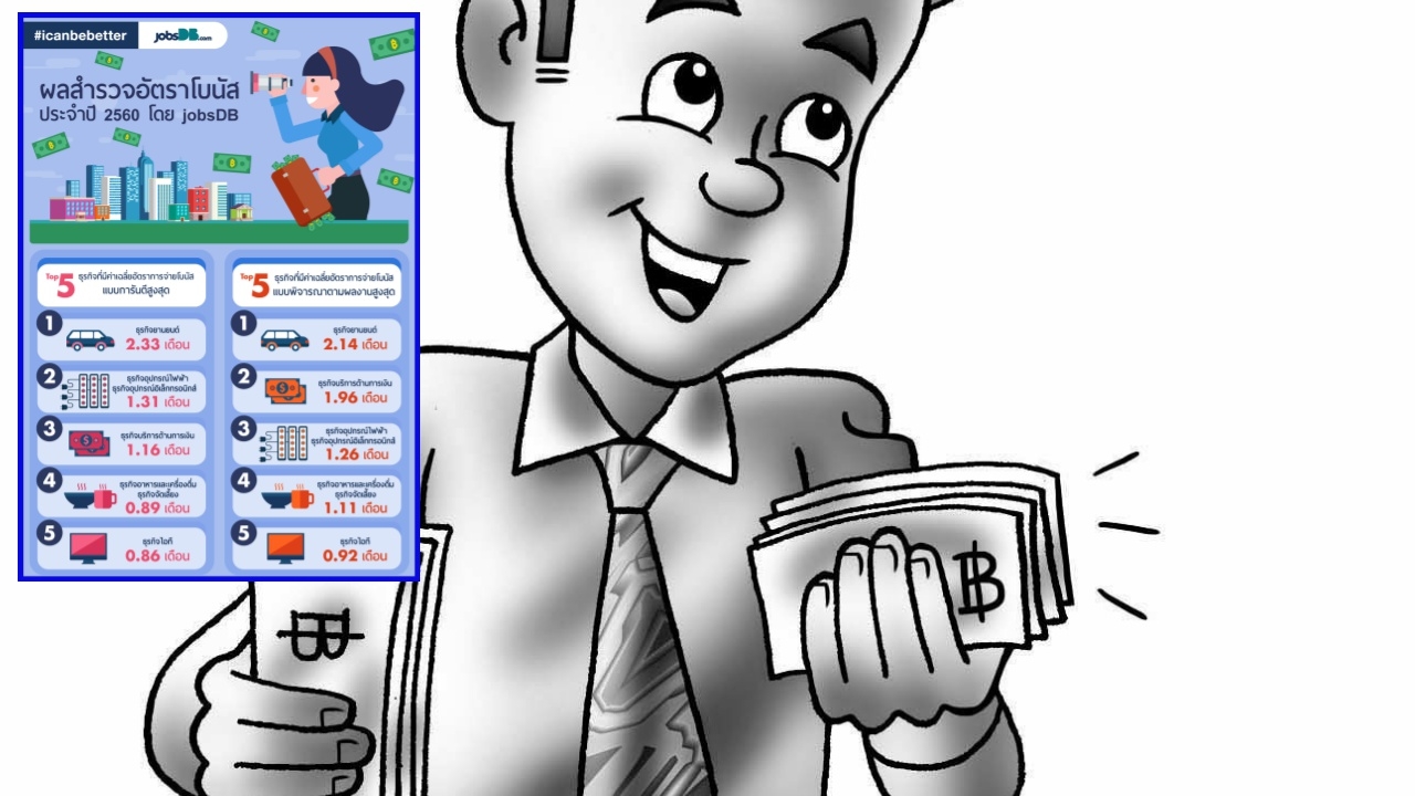 บริษัท จัดหางาน จ๊อบส์ ดีบี (ประเทศไทย) จำกัด เปิดเผยผลสำรวจอัตราการจ่ายโบนัสในประเทศไทย ประจำปี 2560 จากผู้หางานจำนวน 2,020 ราย และผู้ประกอบการจำนวน 322 องค์กรทั่วประเทศ จาก 26 สายงาน และกว่า 47 ประเภทธุรกิจ พบว่า 46% ของผู้ประกอบการยังคงตระหนักว่าโบนัสเป็นเครื่องมือที่มีประสิทธิภาพที่สามารถวัดผลการตัดสินใจอยู่หรือไปของพนักงาน ขณะที่ 47% ยังเชื่อว่าโบนัสสามารถดึงดูดผู้หางานได้ โดยทั้งผู้ประกอบการ 70% และพนักงาน 49% มีความคิดเห็นสอดคล้องกันว่า โบนัสที่พิจารณาจ่ายตามผลงาน เป็นตัวชี้วัดที่สะท้อนให้เห็นผลสัมฤทธิ์ของความพยายามที่พนักงานทุ่มเทให้กับการทำงาน