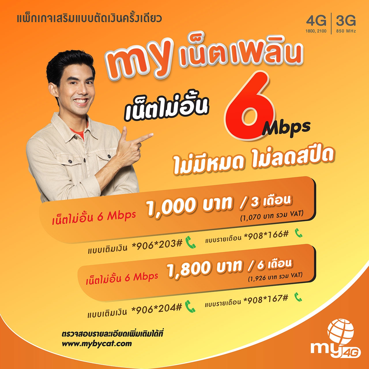 my by CAT เครือข่ายโทรศัพท์มือถือ โดย บริษัท กสท โทรคมนาคม จำกัด (มหาชน) ทางเลือกใหม่ตอบโจทย์ของคนใช้งานเน็ต มีพื้นที่ให้บริการครอบคลุมทั่วประเทศ เค้าออกแพ็กเกจอินเทอร์เน็ต ความเร็ว 6 Mbps เล่นเน็ตได้เร็วแบบไม่จำกัด ไม่ลดสปีด เป็นแพ็กเกจที่น่าสนใจมากเลยทีเดียว ใช้เล่นเน็ตแบบชิลๆ ไว้ดูยูทูบ เล่นเกมออนไลน์ ดูหนัง ดูซีรีส์ ดูละครผ่านแอปต่างๆ ไม่ว่าจะ Line TV, Netflix หรือจะใช้แชร์ฮอตสปอตกับอุปกรณ์อื่นๆ ก็สามารถทำได้แบบไม่มีสะดุด ทุกที่ ทุกเวลา