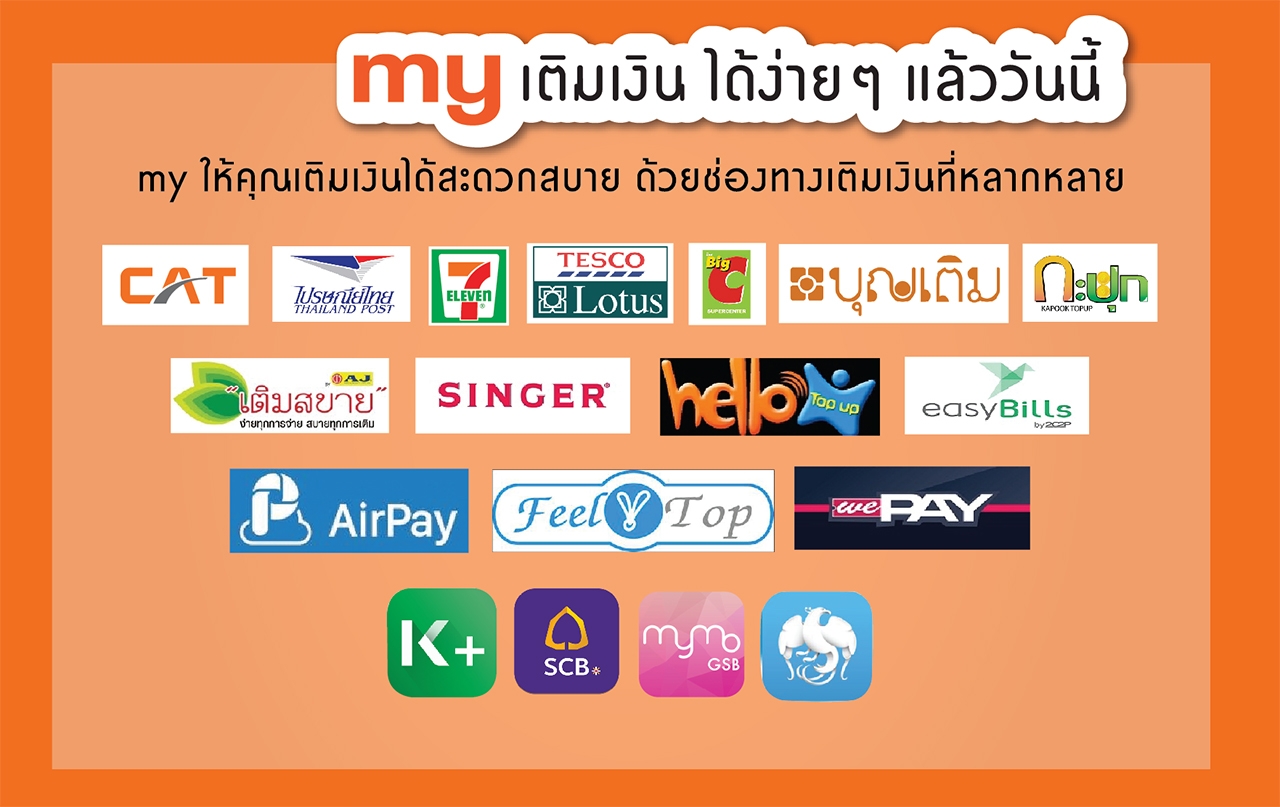 สำหรับ my by CAT แบบเติมเงิน ก็สามารถเติมเงินออนไลน์ได้หลายช่องทาง ทั้งผ่าน mobile banking, ตู้เติมเงินต่างๆ และร้านสะดวกซื้อทั่วประเทศ