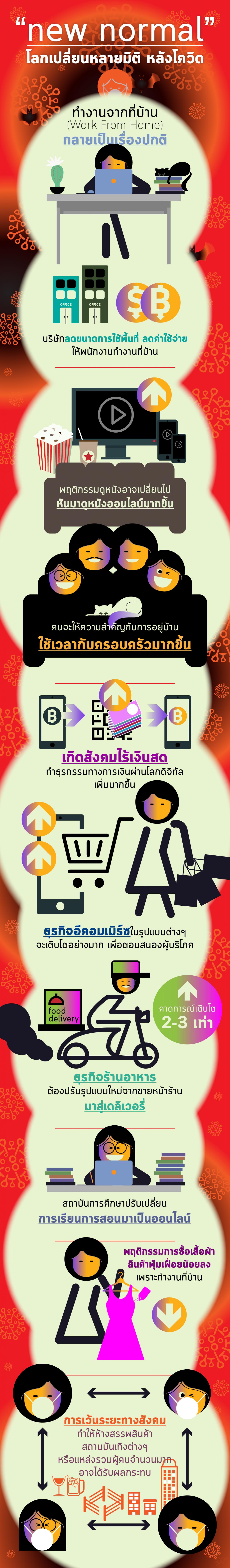 เป็นที่มาของคำว่า "New Normal" หรือ "ความปกติใหม่" เป็นโลกหลังโควิดที่จะเกิดขึ้นในอนาคตเกี่ยวกับวิถีชีวิตแบบใหม่ของผู้คน ซึ่งกูรูหลายๆ วงการ ต่างประเมินและทำนายกันต่างๆ นานา หรืออาจเป็นเพียงการจินตนาการก็ได้