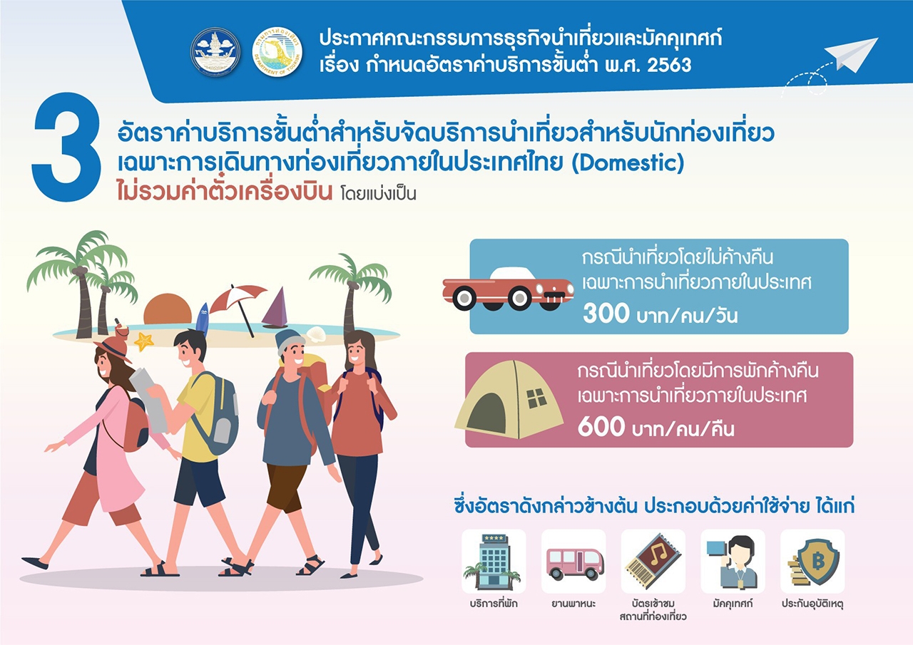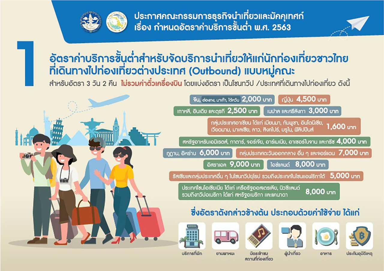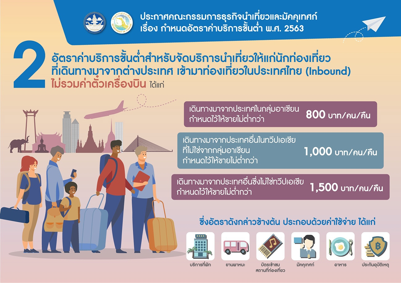 ในขณะที่สถานการณ์การแพร่ระบาดของโรค COVID 19 กำลังคลี่คลาย การเตรียมความพร้อม เพื่อให้ภาคอุตสาหกรรมการท่องเที่ยวของประเทศสามารถกลับมาสร้างความเข้มแข็งให้กับเศรษฐกิจประเทศ จึงเป็นสิ่งสำคัญยิ่ง โดยเฉพาะภาคการประกอบธุรกิจนำเที่ยว ดังนั้น เพื่อรองรับการเดินทางท่องเที่ยวของนักท่องเที่ยว ทั้งชาวไทยและชาวต่างชาติ ให้ได้รับความเป็นธรรม และลดปัญหาข้อร้องเรียนจากนักท่องเที่ยว กรมการท่องเที่ยว กระทรวงการท่องเที่ยวและกีฬา โดยคณะกรรมการธุรกิจนำเที่ยวและมัคคุเทศก์ จึงได้มีประกาศ เรื่อง กำหนดอัตราค่าบริการขั้นต่ำ พ.ศ.2563 ซึ่งจะเริ่มมีผลใช้บังคับตั้งแต่วันที่ 15 มิถุนายน 2563 เป็นต้นไป