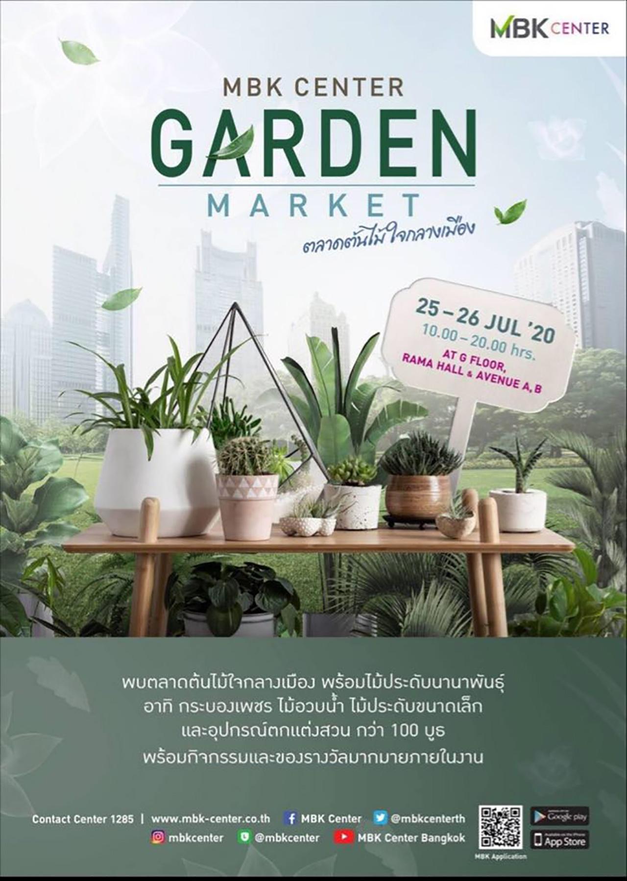 ผู้สื่อข่าวรายงานว่า สืบเนื่องจากกระแสความนิยมการปลูกต้นไม้ และกระแสนิวนอร์มอล ศูนย์การค้าเอ็ม บี เค เซ็นเตอร์ เตรียมจัดงาน MBK CENTER GARDEN MARKET ตลาดต้นไม้ใจกลางเมืองขึ้น ณ ศูนย์การค้าเอ็ม บี เค เซ็นเตอร์ กรุงเทพฯ ระหว่างวันที่ 25-26 ก.ค.2563 บริเวณชั้น G ลานอเวนิว โซน A, B และลานรามา ฮอลล์ (RAMA HALL) ตั้งแต่เวลา 10.00 - 20.00 น.