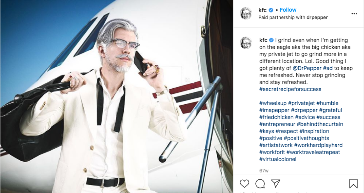 อินฟลูเอนเซอร์เสมือนจริงยังปรากฏในการตลาดของอาหารฟาสต์ฟู้ดชื่อดังอย่าง KFC ที่ได้สร้างตัวตน ผู้พันแซนเดอร์ส โดยเปลี่ยนภาพลักษณ์จากคุณลุงรอยยิ้มสดใสที่ยืนอยู่หน้าร้านอย่างที่เราๆ คุ้นตา กลายมาเป็นหนุ่มฮอตสุดหล่อด้วยเทคโนโลยีเสมือนจริงในอินสตาแกรมของ KFC ที่มีผู้ติดตามมากถึง 1.3 ล้านคน