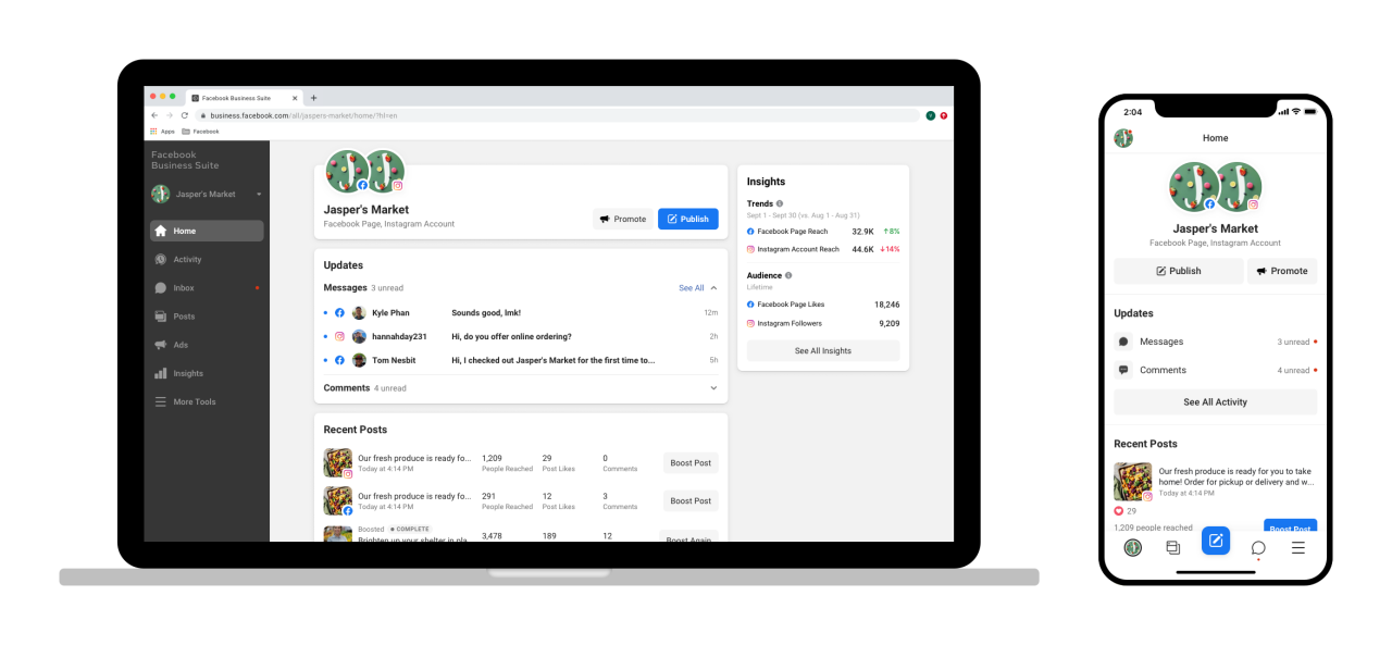 สำหรับ Facebook Business Suite ช่วยให้ธุรกิจขนาดกลางและขนาดเล็กสามารถเผยแพร่และจัดการโพสต์ต่างๆ บน Facebook และ Instagram ได้พร้อมๆ กัน ในขณะเดียวกัน ยังสามารถดูข้อความและการแจ้งเตือนได้ในที่เดียว จึงช่วยให้ธุรกิจสามารถติดตามการอัปเดตอยู่เสมอและโต้ตอบกับลูกค้าได้อย่างทันท่วงที