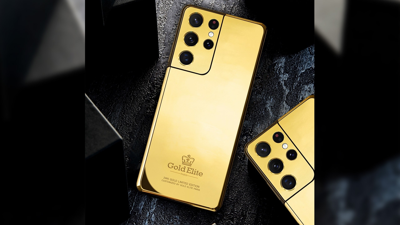 สำหรับสมาร์ทโฟนรุ่นลิมิเต็ดอิดิชั่น Gold Elite Galaxy S21 Ultra 5G 24KT Gold เป็นสมาร์ทโฟนที่ผลิตจากทองคำบริสุทธิ์ 24K หรือ 99.9% ดีไซน์กล้องแบบคอนทัวร์ คัท (Contour cut) กับวัสดุผิวด้านแบบ Haze Finish ซึ่งเป็นเอกลักษณ์ของ Samsung Galaxy S21 Ultra 5G