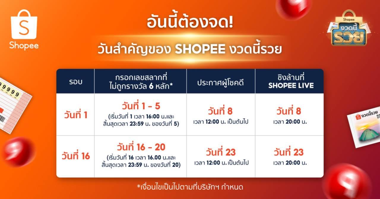 ช้อปปี้ เยียวยาคนไม่ถูกรางวัลด้วยแคมเปญ "Shopee งวดนี้รวย" เก็บหวย ชิงเงินล้าน ด้วยรางวัล 2 ต่อพร้อมอัดฉีดรางวัลกว่า 50 รางวัล รวมมูลค่ากว่าล้านบาท เป็นแคมเปญที่จับอินไซต์ผู้บริโภคชาวไทยและมอบโอกาสให้กับนักช็อปชาวไทยกับช้อปปี้ ด้วย 3 ขั้นตอนง่ายๆ เพียง 1. กดเข้าแอปช้อปปี้เพื่อร่วมแคมเปญ Shopee งวดนี้รวย เก็บหวย ชิงเงินล้าน