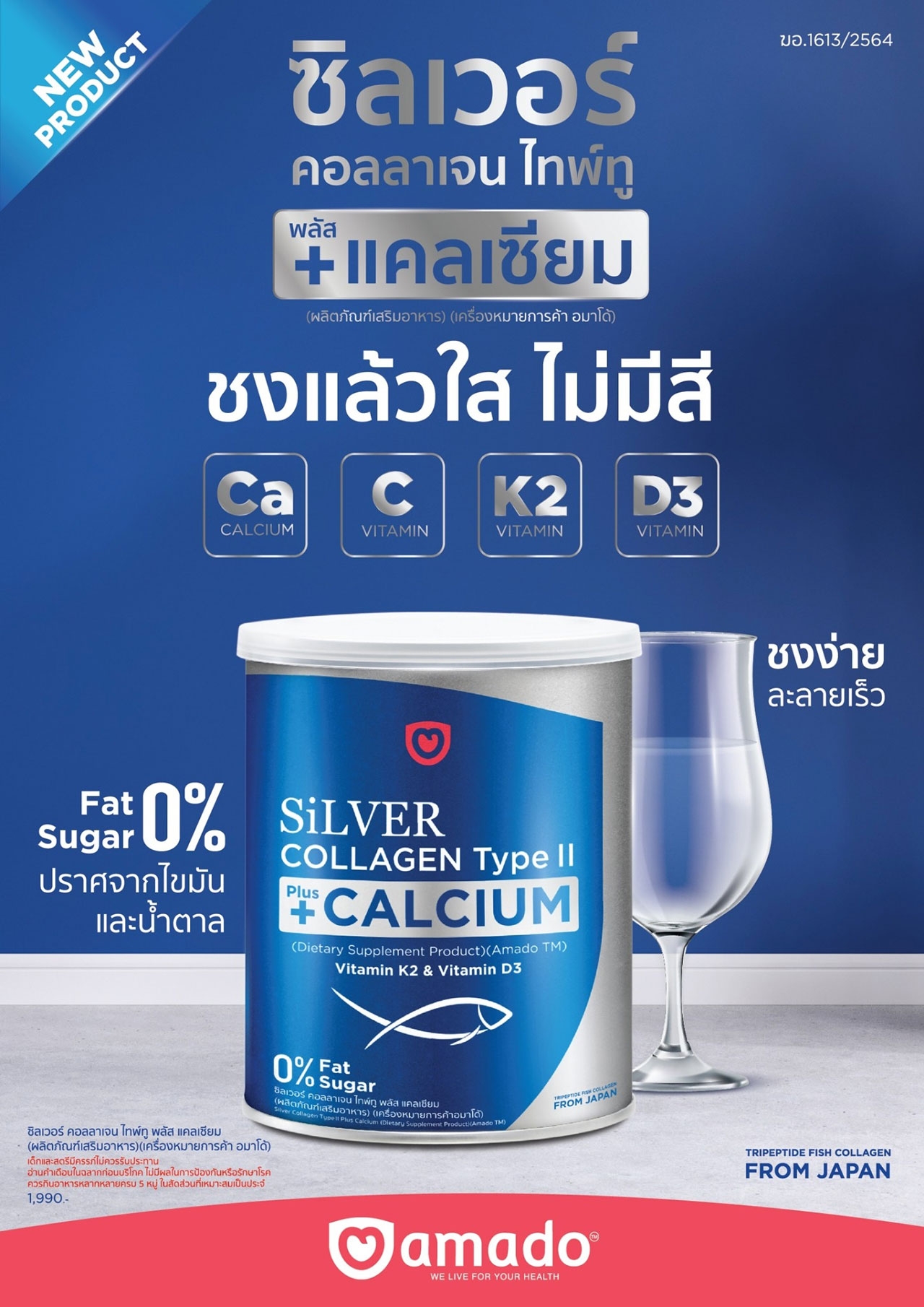 บริษัท อมาโด้ กรุ๊ป จำกัด ผู้จัดจำหน่ายผลิตภัณฑ์ภายใต้แบรนด์ อมาโด้ (amado) ผู้เชี่ยวชาญด้านวิตามินและผลิตภัณฑ์เสริมอาหารชั้นนำ เปิดตัวผลิตภัณฑ์คอลลาเจนสูตรใหม่ “ซิลเวอร์ คอลลาเจน ไทพ์ทู พลัส แคลเซียม (Silver Collagen Type II Plus Calcium)” เจาะตลาดผู้สูงวัยสอดรับกระแสสังคมผู้สูงอายุในไทยอย่างสมบูรณ์ คาดยอดคอลลาเจนสูตรใหม่ 500 ล้านบาท หวังชูโรงดันยอดขายเข้าเป้าในครึ่งปีหลัง พร้อมทั้งกวาดยอดขาย 4 เดือนไปแล้วกว่า 1,000 ล้านบาท ยังเดินหน้ารุกตลาดด้วยการเปิดรับตัวแทนจำหน่ายใหม่เพิ่ม 1,000 คน รับตลาดอาหารเสริมและวิตามินโตเพราะเทรนด์ดูแลสุขภาพอย่างเข้มข้น หวังดันยอดปีนี้ทะลุ 3,000 ล้านบาท