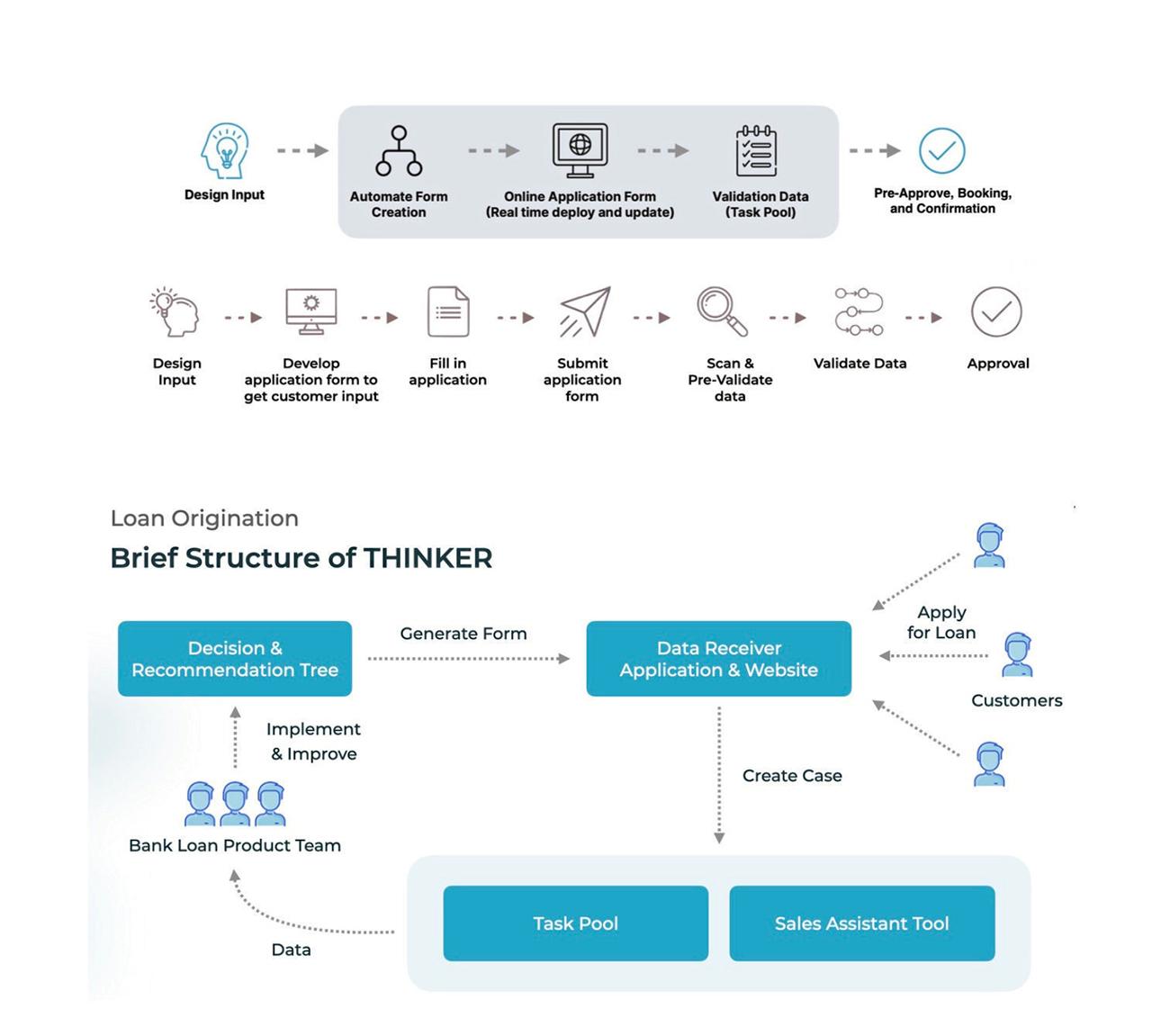 ทั้งนี้ จากปัญหาของสถาบันการเงินคือการใช้ระบบการเงินการธนาคารที่มีความซับซ้อน ขั้นตอนซ้ำซ้อน ระยะเวลาในการพิจารณาอนุมัติใช้เวลาค่อนข้างนาน และมีต้นทุนในการดูแลที่สูง อีกทั้งฟังก์ชันการทำงานยังไม่เอื้อกับประโยชน์ของลูกค้าที่มาใช้บริการ เป็นต้น จึงพัฒนาผลิตภัณฑ์ Thinker series ออกมารองรับ
