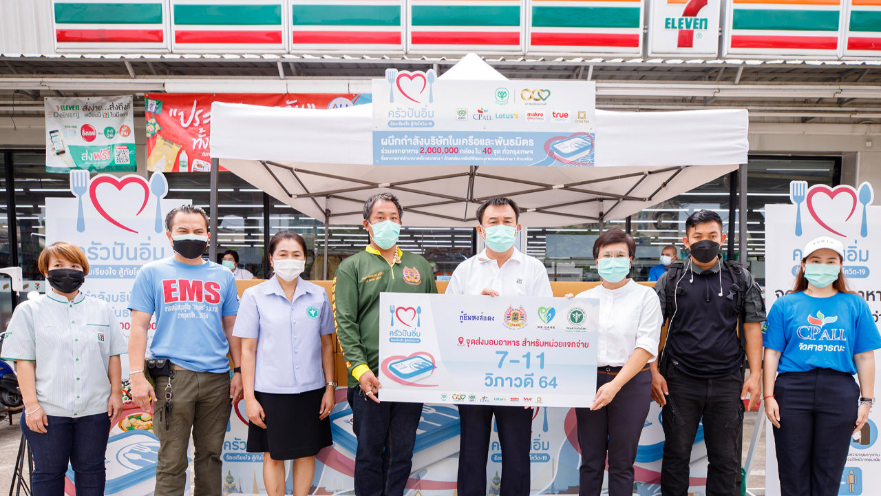 นายวิชัย จันทร์จริยากุล กรรมการผู้จัดการ (ร่วม) บมจ. ซีพี ออลล์ ผู้บริหารเซเว่นอีเลฟเว่น และ เซเว่น เดลิเวอรี่ พร้อมด้วยจิตสาธารณะซีพี ออลล์ ร่วมส่งมอบอาหารปรุงสุกพร้อมรับประทานและหน้ากากอนามัย ภายใต้โครงการ ครัวปันอิ่ม ร้อยเรียงใจสู้ภัยโควิด-19 ของเครือเจริญโภคภัณฑ์ ให้แก่ผู้แทนจากสาธารณสุข จ.นนทบุรี มูลนิธิร่วมกตัญญู กู้ชีพหงส์แดง เพื่อนนักดับเพลิงและ CKK Fire เพื่อสนับสนุนการทำงานหน่วยงานภาครัฐและทีมอาสากู้ภัย นำไปแจกจ่ายสู่ชุมชนที่รับผลกระทบจากโควิด-19 ณ ร้านเซเว่น อีเลฟเว่น วิภาวดี รังสิต 64
