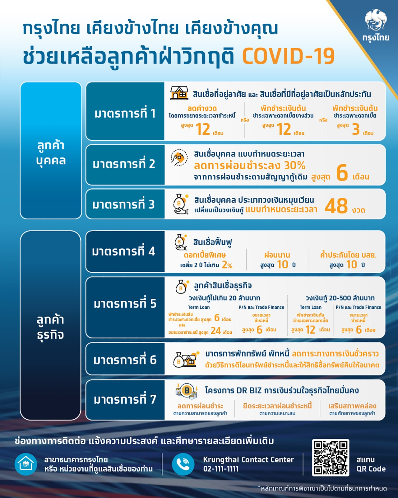 เพื่อให้ทุกคนได้ยืนไหว และไปต่อด้วยกัน...ธนาคารกรุงไทยปล่อย 7 มาตรการช่วยเหลือลูกค้าฝ่าวิกฤติ โควิด-19 แบ่งความช่วยเหลือเป็นลูกค้าภาคธุรกิจ 4 มาตรการ และลูกค้ารายบุคคล 3 มาตรการ เพราะเข้าใจถึงปัญหาของทุกคน ไม่เพียงแต่จะจัดการกับหนี้เดิมไม่ได้แล้ว แต่ยังต้องการเงินหมุนเวียนใหม่อีกด้วย ดังนั้น การช่วยเหลือจึงมีทั้งพักชำระหนี้ ยืดระยะเวลาชำระหนี้เดิม ให้กู้สินเชื่อตัวใหม่ในอัตราดอกเบี้ยต่ำ ผ่อนชำระได้นานกว่าเดิม