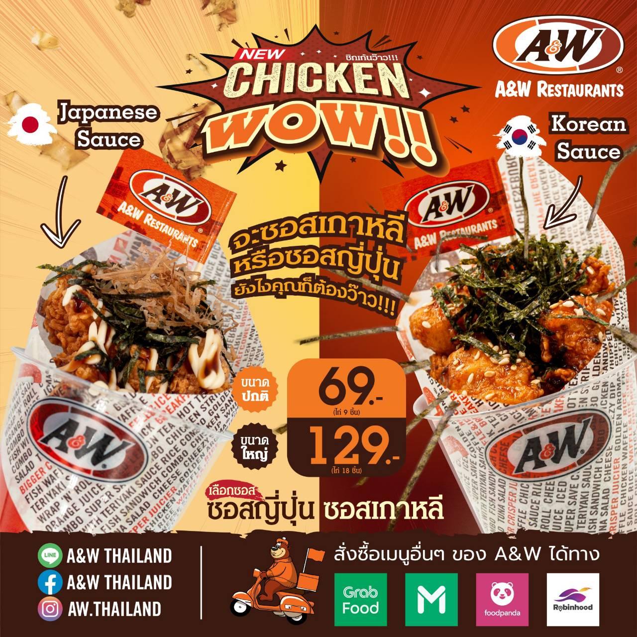 A&W Thailand แนะนำเมนูใหม่สุดปัง A&W Chicken WOW อร่อยกับไก่ทอดสูตรเด็ดของ A&W กรอบนอกนุ่มใน จากสันในไก่ชุปแป้งทอดสูตรพิเศษเฉพาะ A&W มาพร้อมซอสให้เลือก 2 รสชาติ Japanese Sauce รสชาติกลมกล่อม ท็อปด้วยปลาแห้ง ได้กลิ่นอายญี่ปุ่น หรือใครชอบสไตล์เกาหลี ต้องเลือกทาน Korean Sauce หวานเผ็ดกำลังดี หอมงาคั่ว ตามแบบฉบับไก่ทอดเกาหลี โรยงาขาวคั่วหอมๆ และสาหร่าย ที่ให้ความฟินเหมือนได้บินไปทานที่ต้นตำรับ ตั้งแต่วันนี้ถึง 30 พ.ย. 64