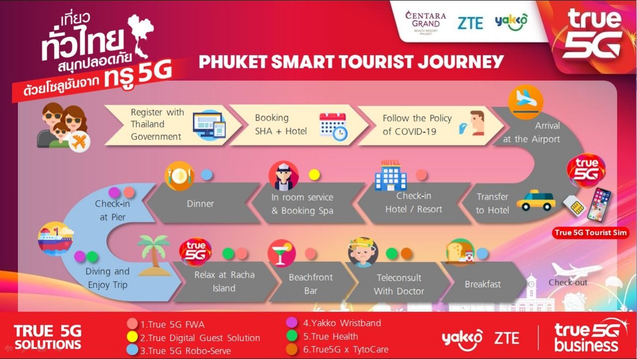ขณะเดียวกันทรูยังได้ร่วมมือกับ Tech partner อย่าง Yakko แพลตฟอร์มระบบบริหารจัดการธุรกิจท่องเที่ยวเชื่อมต่อกับท่าเรือและสถานที่ท่องเที่ยวต่างๆ โดยนำร่องที่ท่าเรือฉลอง, Love Andaman และ The Racha บนเกาะราชาใหญ่ ซึ่งจะสามารถยืนยันตัวตนนักท่องเที่ยวแทนตั๋วโดยสารเรือด้วย Wristband ควบคู่กับการทำ Self Check-in เพื่อเพิ่มความรวดเร็ว ลดความแออัดในท่าเรือ และยังมีอุปกรณ์ที่สามารถระบุตำแหน่งปัจจุบันของเรือเพื่อขอความช่วยเหลือ หรือแจ้งจุดนัดพบ เพิ่มความปลอดภัยให้นักท่องเที่ยวได้อีกขั้น