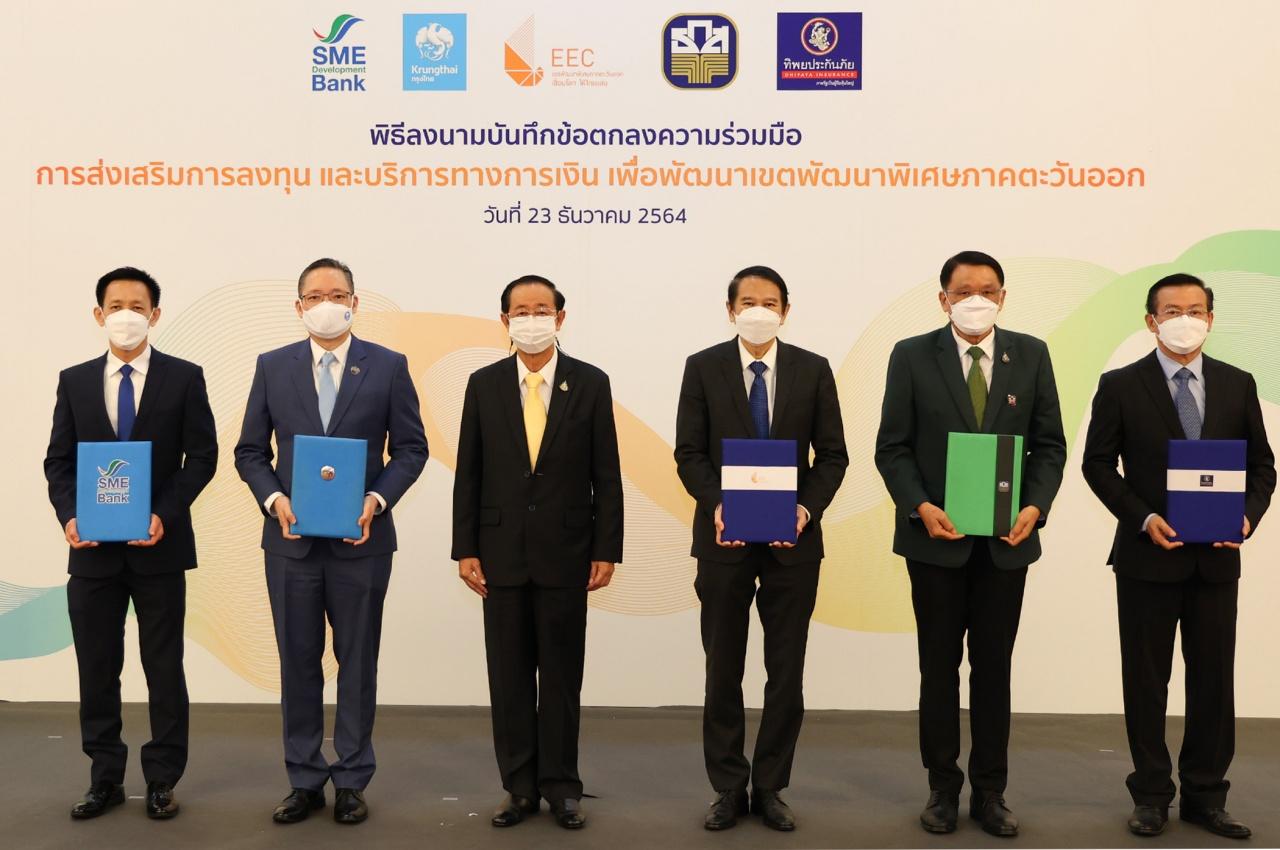 นายคณิศ แสงสุพรรณ เลขาธิการคณะกรรมการนโยบายเขตพัฒนาพิเศษภาคตะวันออก ดร.สมพร สืบถวิลกุล ประธานเจ้าหน้าที่บริหาร บมจ. ทิพย กรุ๊ป โฮลดิ้งส์ และ กรรมการผู้จัดการใหญ่ บมจ.ทิพยประกันภัย ร่วมกันลงนามบันทึกข้อตกลง (MOU) ความร่วมมือการส่งเสริมการลงทุน และบริการทางการเงินเพื่อพัฒนาเขตพัฒนาพิเศษภาคตะวันออก