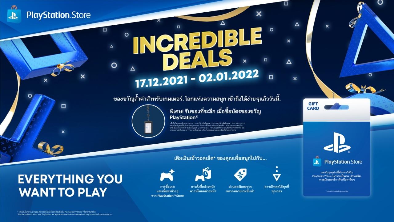 บัตรของขวัญ PlayStation ร่วมเฉลิมฉลองเทศกาลแห่งความสุขส่งท้ายปีเก่าต้อนรับปีใหม่ จัดโปรโมชั่นสุดพิเศษ Incredible Deals พร้อมมอบของขวัญล้ำค่าสำหรับเหล่าเกมเมอร์ที่จะปลดล็อกโลกแห่งความสนุกไปกับบัตรของขวัญ PlayStation ในราคา 1,000 และ 2,500 บาทจากร้านสะดวกซื้อชั้นนำทั่วประเทศไม่ว่าจะเป็น เซเว่นอีเลฟเว่น, มินิ บิ๊กซี, แฟมิลี่มาร์ท, โลตัส เอ็กซ์เพรส และโลตัส โก เฟรช พร้อมลงทะเบียนรับฟรีที่นี่ ของที่ระลึกสุดเอ็กซ์คลูซีฟ ตั้งแต่วันนี้ถึง 2 ม.ค.65 เท่านั้น