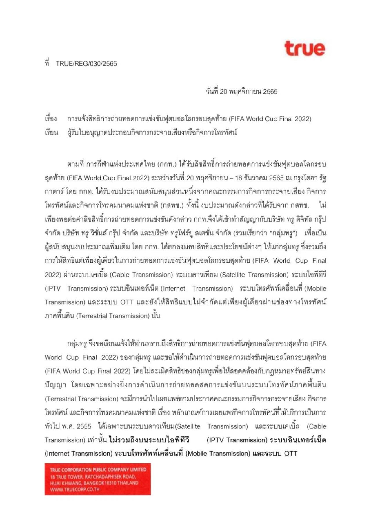 TRUE ทำหนังสือชี้แจงผู้รับใบอนุญาตประกอบการกิจการโทรทัศน์หากการถ่ายทอดสดฟุตบอล 2022 ต้องไม่ละเมิดสิทธิของกลุ่มทรู
