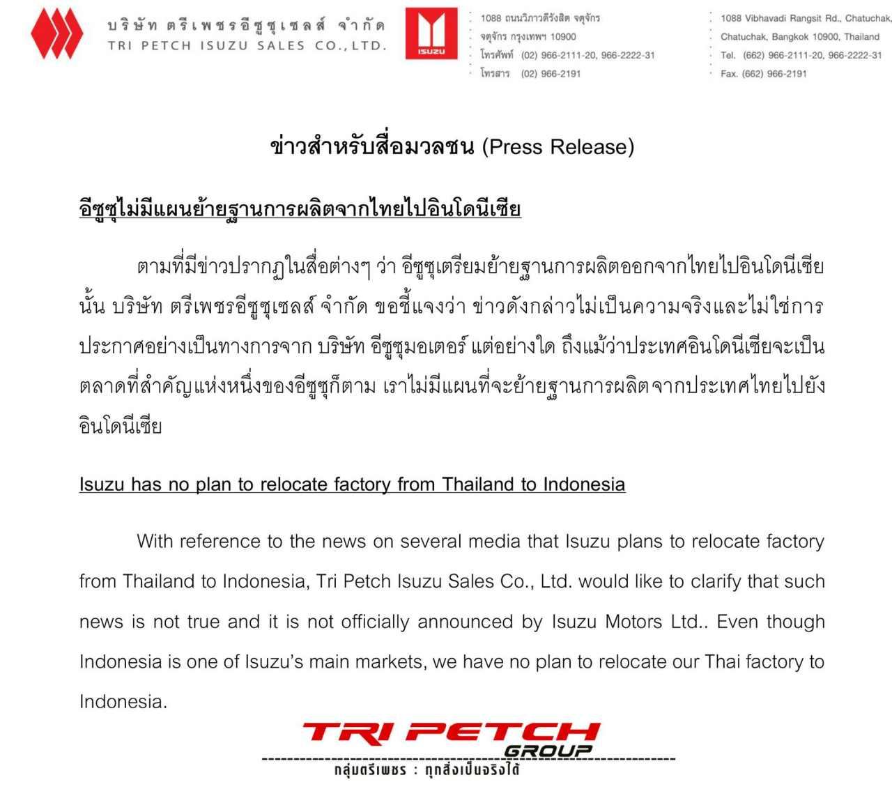 เมื่อวันที่ 8 มิ.ย. 66 ผู้สื่อข่าวรายงานว่า สำนักงานประชาสัมพันธ์ บริษัท ตรีเพชรอีซูซุเซลส์ จำกัด ระบุว่า ตามที่มีข่าวปรากฏในสื่อต่างๆ ว่า อีซูซุ หรือ ISUZU เตรียมย้ายฐานการผลิตออกจากไทยไปอินโดนีเซียนั้น บริษัท ตรีเพชรอีซูซุเซลส์ จำกัด ขอชี้แจงว่า ข่าวดังกล่าวไม่เป็นความจริง และ ไม่ใช่การประกาศอย่างเป็นทางการจาก บริษัท อีซูซุมอเตอร์ แต่อย่างใด ถึงแม้ว่าประเทศอินโดนีเซียจะเป็นตลาดที่สำคัญแห่งหนึ่งของอีซูซุก็ตาม เราไม่มีแผนที่จะย้ายฐานการผลิตจากประเทศไทยไปยังอินโดนีเซีย
