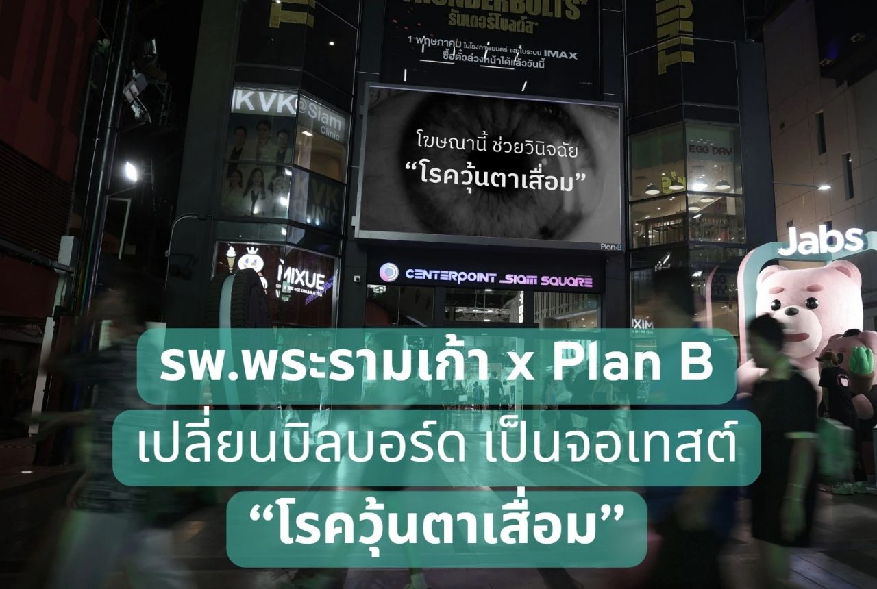 โรงพยาบาลพระรามเก้า ตระหนักถึงความสำคัญของโรควุ้นตาเสื่อมจึงผนึกกำลังกับ Plan B Media เปิดตัวบิลบอร์ดกลางเมืองให้เป็นสัญญาณเตือนภัย ที่ไม่เพียงแค่โฆษณา แต่ออกแบบมาให้คุณสามารถตรวจเช็กตัวเองง่าย ๆ ว่ามีภาวะเสี่ยงวุ้นตาเสื่อมหรือไม่ ด้วย 3 เวอร์ชันที่จำลองอาการจริงของผู้ป่วย ทั้งการเห็นหยากไย่ จุดดำ และวุ้นน้ำขุ่นในสายตา ออกแบบตามหลักการแพทย์อย่างถูกต้อง และมี Call to Action ที่ชัดเจน: อย่ารอให้สาย รีบมาตรวจดวงตากับผู้เชี่ยวชาญ