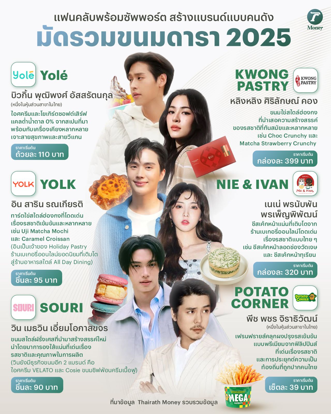 ตลอดช่วงปีที่ผ่านมา วงการอาหาร เครื่องดื่ม และคาเฟ่ในบ้านเราเรียกได้ว่าคึกคักเป็นพิเศษ ไม่ว่าจะเป็นการเปิดตัวของแบรนด์ต่างชาติชื่อดังที่ต่อคิวเจาะตลาดไทยกันอย่างคึกคัก หรือแบรนด์ไทยหน้าใหม่ที่น่าจับตา แต่หนึ่งในกระแสที่มาแรงแบบฉุดไม่อยู่ก็คือ การก้าวเข้าสู่โลกธุรกิจของเหล่าศิลปิน ดารา และอินฟลูเอนเซอร์ไทยที่หันมาเปิดตัวแบรนด์อาหารและขนมที่สามารถสร้างยอดขายถล่มทลายตั้งแต่วันแรก