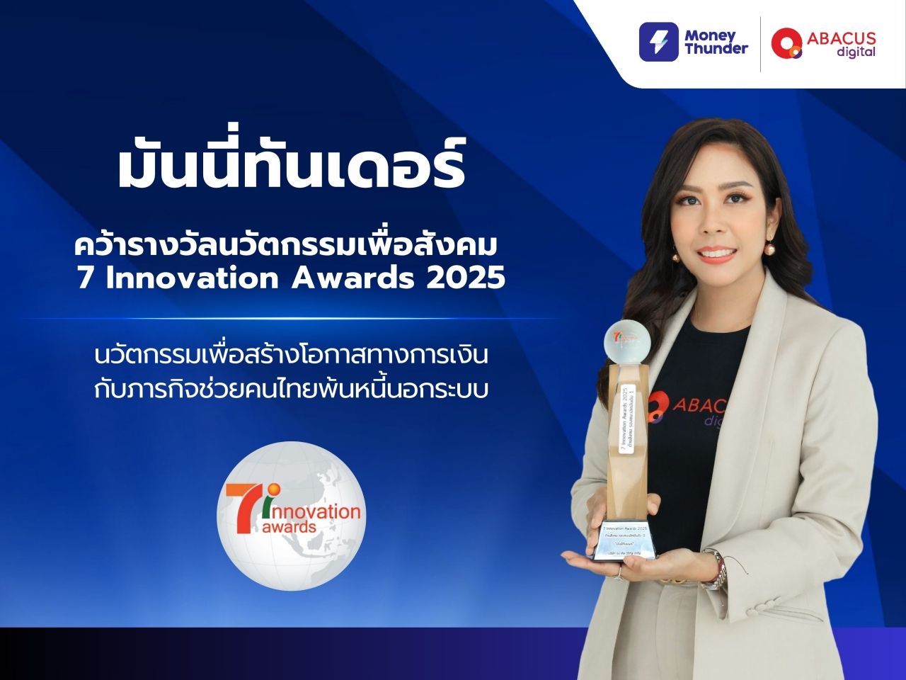 รับรางวัลใหญ่ : บริษัท อบาคัส ดิจิทัล จำกัด ผู้พัฒนาแอปพลิเคชันสินเชื่อออนไลน์มันนี่ทันเดอร์ (MoneyThunder) ได้รับรางวัลนวัตกรรมเพื่อสังคม (Social Contribution) จากเวที 7 Innovation Awards 2025 ตอกย้ำบทบาทของบริษัทในฐานะผู้นำด้านฟินเทคของไทย ที่นำเทคโนโลยีมาขับเคลื่อนโอกาสทางการเงินให้กับคนไทยแล้วว่า 2.4 หมื่นล้าน โดยเฉพาะกลุ่มที่ยังเข้าไม่ถึงแหล่งทุนในระบบ เพื่อให้สามารถหลุดพ้นจากการพึ่งพาหนี้นอกระบบ และเข้าถึงสินเชื่อที่ปลอดภัย โปร่งใส และเป็นธรรม