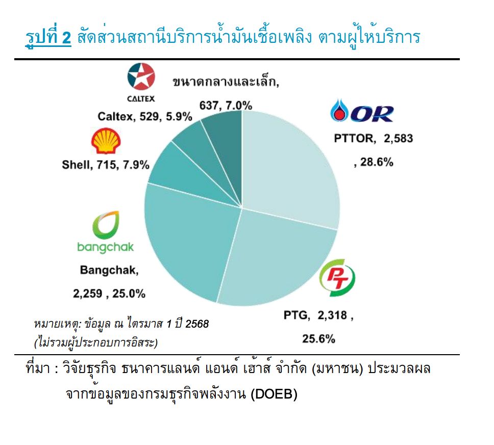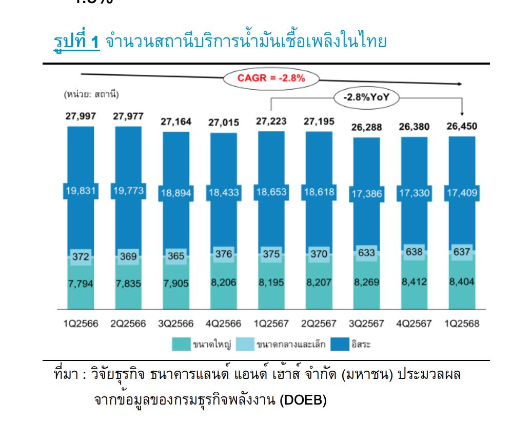 ประเทศไทยมีสถานีบริการน้ำมันอยู่ราว 26,450 แห่ง (ข้อมูล Q1/2568) แบ่งเป็น