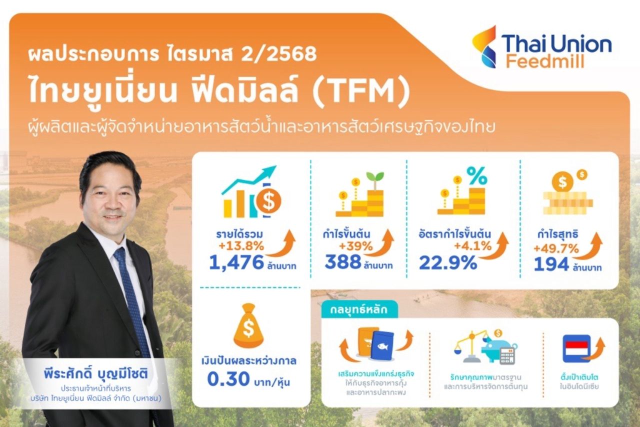 นายพีระศักดิ์ บุญมีโชติ ประธานเจ้าหน้าที่บริหาร บริษัท ไทยยูเนี่ยน ฟีดมิลล์ จำกัด (มหาชน) เปิดเผยถึงผลการดำเนินงานในไตรมาส 2/2568 ว่า บริษัทฯ ประสบความสำเร็จในการเติบโต โดยมียอดขายและกำไรสุทธิสูงสุดเป็นประวัติการณ์ นับตั้งแต่เข้าจดทะเบียนในตลาดหลักทรัพย์ฯ ด้วยยอดขาย 1,476 ล้านบาท เพิ่มขึ้น 13.8% หากเทียบจากช่วงเดียวกันของปีก่อน เป็นผลจากการขยายตัวอย่างแข็งแกร่งของยอดขายตลาดในประเทศ