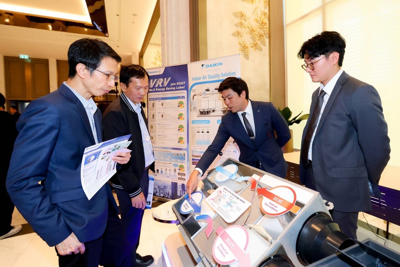 ทั้งนี้ เพื่อลดปัญหาดังกล่าว ไดกิ้นจึงพัฒนา Energy-Saving Ventilation System ที่สามารถลดความชื้นของอากาศก่อนนำเข้าสู่อาคาร พร้อมระบบแลกเปลี่ยนความร้อนกับอากาศภายใน ช่วยให้สามารถตั้งอุณหภูมิสูงขึ้นที่ 26–27°C ได้โดยยังรู้สึกเย็นสบาย และลดการใช้พลังงานไฟฟ้าได้มากกว่า 35% เมื่อเทียบกับระบบเดิม และหากใช้งานร่วมกับแอร์ระบบอินเวอร์เตอร์และระบบ Heat Recovery จะสามารถลดการใช้ไฟฟ้าลงได้สูงสุดถึง 60%