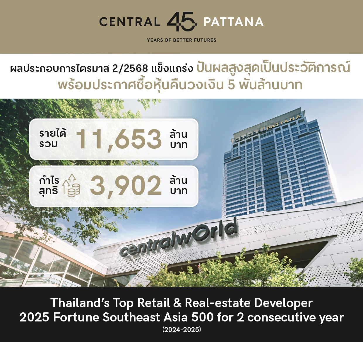ธุรกิจหลักอย่างศูนย์การค้าทำผลงานโดดเด่น ยอดขายผู้เช่าเพิ่มขึ้นต่อเนื่องจากแบรนด์ใหม่ทั้งในและต่างประเทศ บวกกับการควบคุมค่าใช้จ่ายด้านพลังงานและการตลาดอย่างมีประสิทธิภาพ ทำให้กำไรเติบโตแบบก้าวกระโดด พร้อมเปิดแผนขยายโครงการครั้งใหญ่ 4 ก.ย.นี้ เปิดตัว “เซ็นทรัล พาร์ค” แลนด์มาร์กใหม่ใจกลางกรุงเทพฯ และ 24 ต.ค. เปิด “เซ็นทรัล กระบี่” ศูนย์การค้าแห่งแรกของจังหวัดกระบี่ รับฤดูกาลท่องเที่ยวไฮซีซั่น คาดดึงทราฟฟิกและรายได้มหาศาล