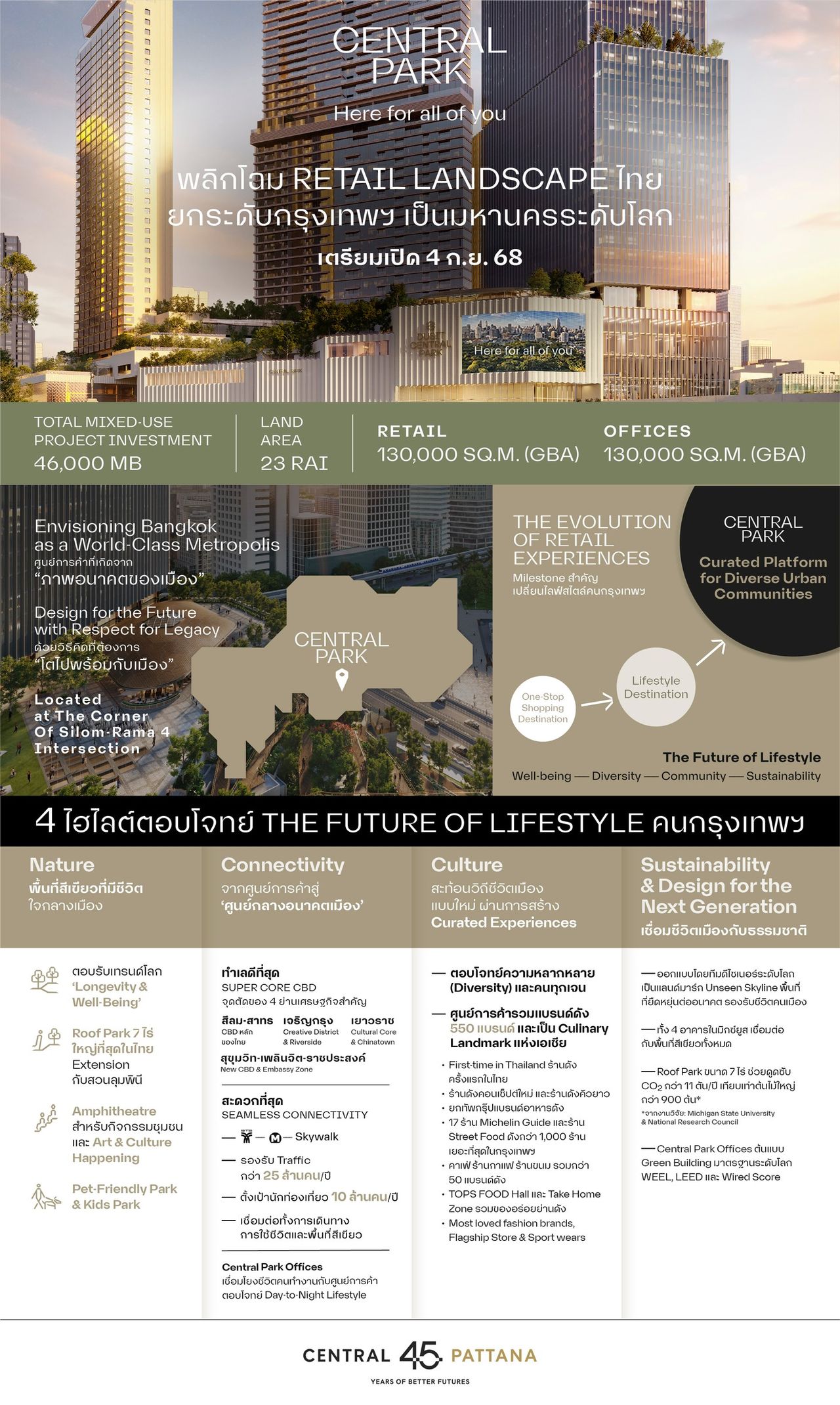 ทั้งนี้ เซ็นทรัล พาร์ค เป็นแบรนด์ศูนย์การค้า และอาคารสำนักงานที่ตั้งอยู่ในโครงการมิกซ์ยูสระดับโลก หนึ่งเดียวใจกลาง Super Core CBD สำคัญของกรุงเทพฯ ประกอบด้วย ศูนย์การค้า อาคารสำนักงาน โรงแรม และที่พักอาศัย มีมูลค่าการลงทุนทั้งโครงการ 46,000 ล้านบาท พื้นที่รวมทั้งโครงการ 23 ไร่ โดยศูนย์การค้ามีพื้นที่อาคารรวม (GBA)130,000 ตร.ม. และอาคารสำนักงาน 43 ชั้น มีพื้นที่อาคารรวม (GBA) 130,000 ตร.ม.