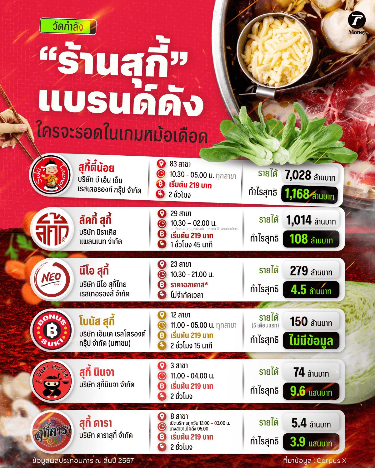 แต่บทสรุปของสงครามราคาและบริการที่กำลังปะทุขึ้นทั้งในเมืองและกระจายไปทั่วประเทศในวันนี้ Thairath Money ชวนแกะรอยความแข็งแกร่งของ 6 แบรนด์สุกี้ชื่อดัง ทั้งในแง่ของขนาดอาณาจักรสาขา เวลาให้บริการที่ตอบโจทย์ชีวิตคนเมืองยุคใหม่ ไปจนถึงผลประกอบการล่าสุดที่เผยให้เห็นว่า “ใครคือผู้เล่นตัวจริงที่กวาดรายได้และกำไรสุทธิมหาศาล” และใครที่กำลังพยายามช่วงชิงส่วนแบ่งการตลาดในเกมหม้อไฟที่ร้อนระอุนี้