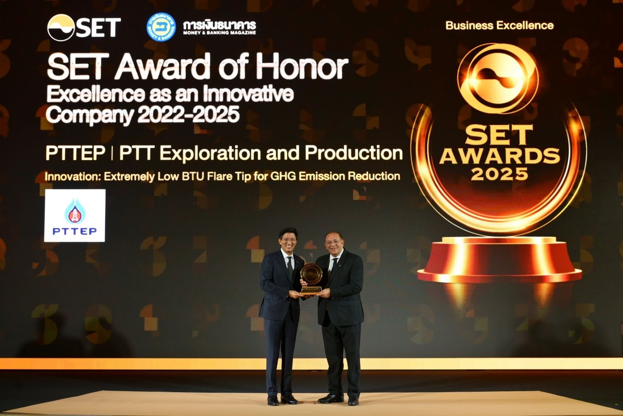 รับรางวัลใหญ่ : นายมนตรี ลาวัลย์ชัยกุล ประธานเจ้าหน้าที่บริหาร บริษัท ปตท.สำรวจและผลิตปิโตรเลียม จำกัด (มหาชน) หรือ ปตท.สผ. เข้ารับ 2 รางวัลอันทรงเกียรติจากงาน SET Awards 2025 ได้แก่ รางวัลเกียรติยศแห่งความสำเร็จด้านนวัตกรรม (SET Award of Honor : Best Innovative Company) ต่อเนื่องเป็นปีที่ 4 จากผลงานนวัตกรรม หัวเผาก๊าซทิ้งเพื่อลดการปล่อยก๊าซเรือนกระจก (Extremely Low BTU Flare Tip for Greenhouse Gas Emission Reduction)