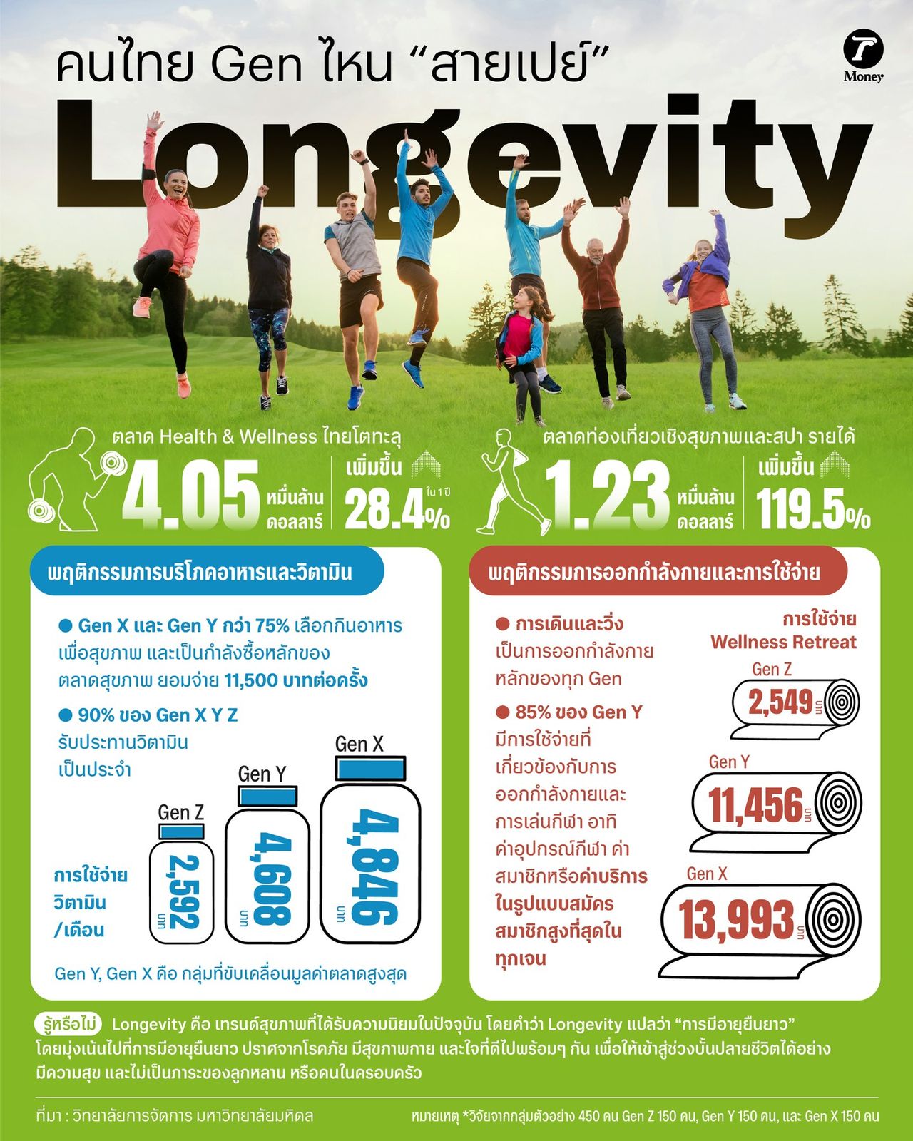 ประกอบกับคนรุ่นใหม่ ที่เริ่มหันมาใส่ใจดูแลคุณภาพชีวิตเพื่ออายุที่ยืนยาวมากขึ้นซึ่งไม่ใช่แค่เพียง “อยู่ได้นาน” แต่ยังต้อง “อยู่ได้ดี” ทำให้แนวคิดเรื่อง Longevity หรือการมีอายุยืนอย่างมีคุณภาพกลายเป็นเทรนด์สำคัญที่น่าจับตาและส่งผลต่อโครงสร้างเศรษฐกิจและตลาดผู้บริโภคอย่างมหาศาล