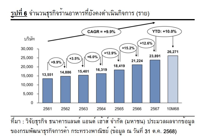ข้อมูลวิจัย LH Bank (ธนาคารแลนด์ แอนด์ เฮ้าส์) เผยว่า ปัจจุบันมีจำนวนร้านอาหารที่ยังดำเนินกิจการอยู่มีสูงถึง 26,271 ราย เพิ่มขึ้น 10.0% (ณ ต.ค. 2568) ท่ามกลางสมรภูมิที่ดุเดือดนี้ เรากลับพบว่ากำลังซื้อของคนไทย "เปราะบาง" อย่างเห็นได้ชัด